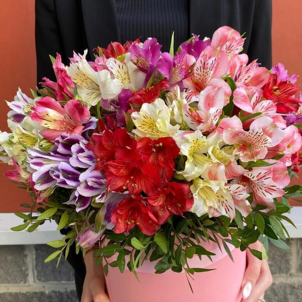 Альстромерия – 25 шт.Оазис флористический – 1 шт.шляпная коробка l – 1 шт.