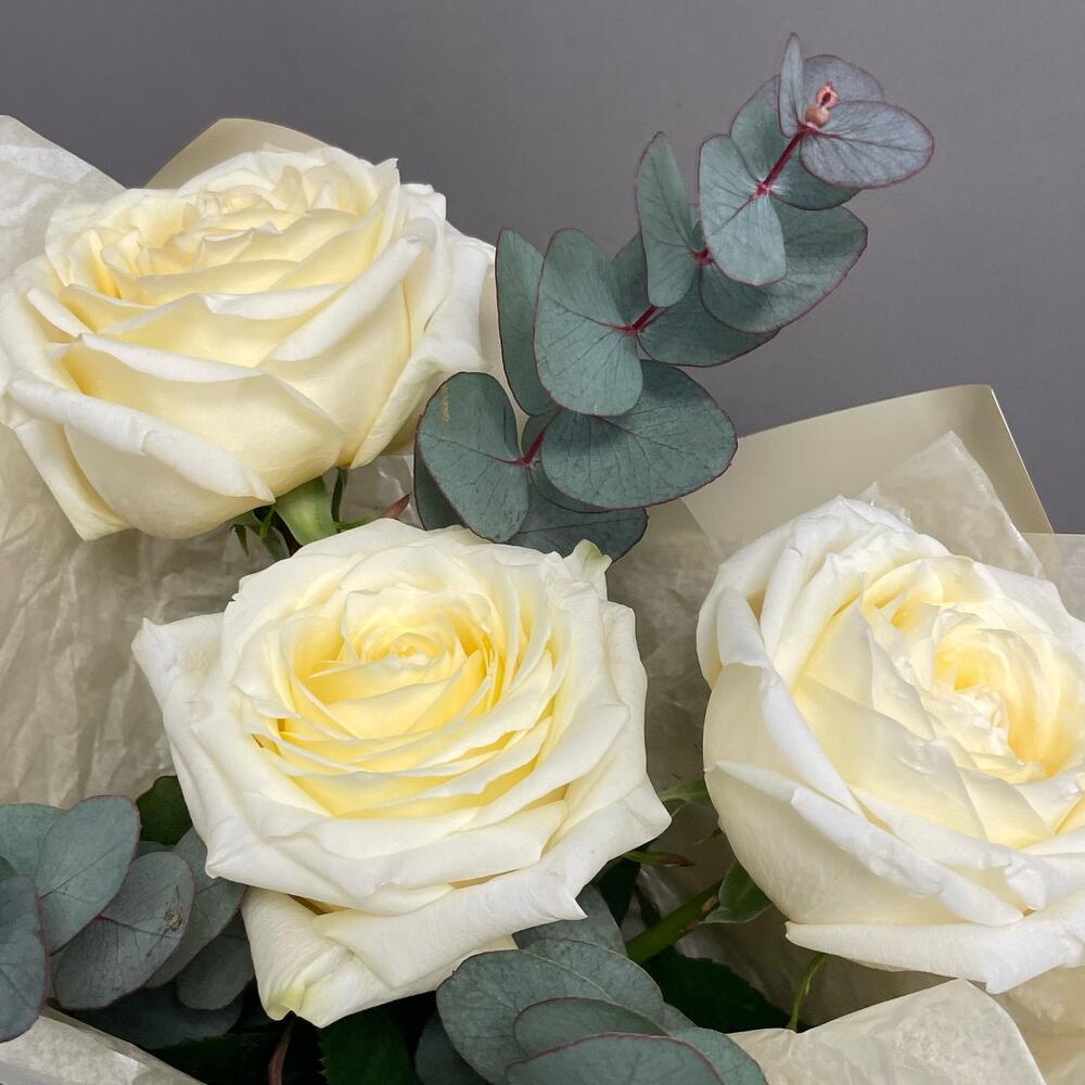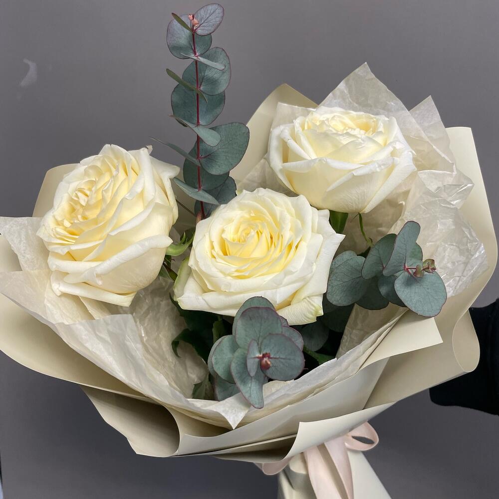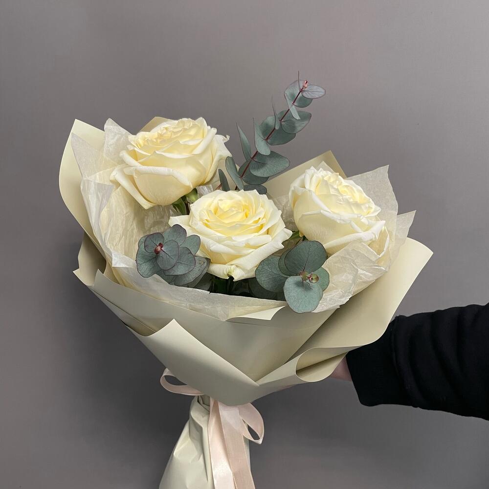 Эвкалипт – 2 шт.Лента атласная – 1 шт.Упаковка дизайнерская – 2 шт.розы кендилайт – 3 шт.