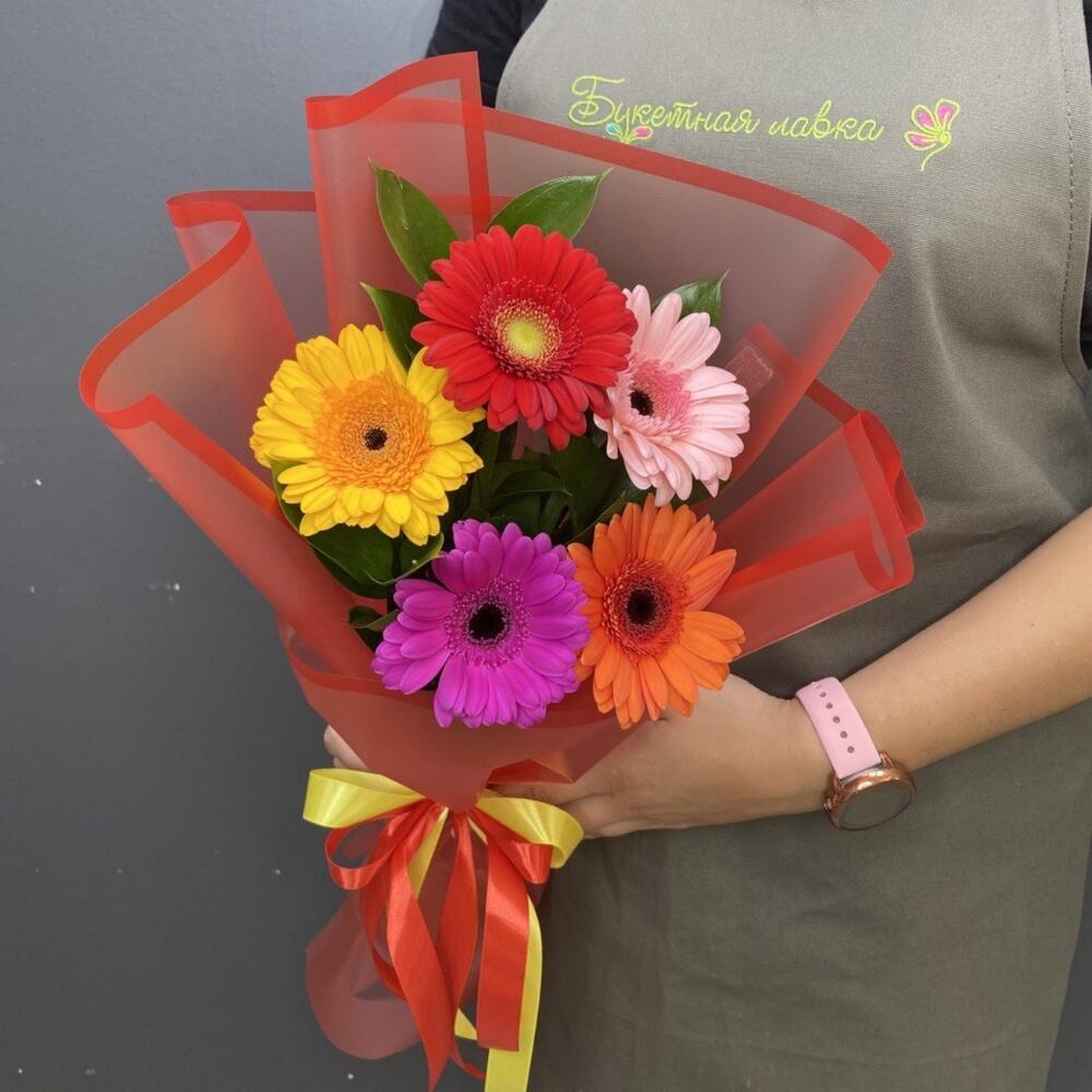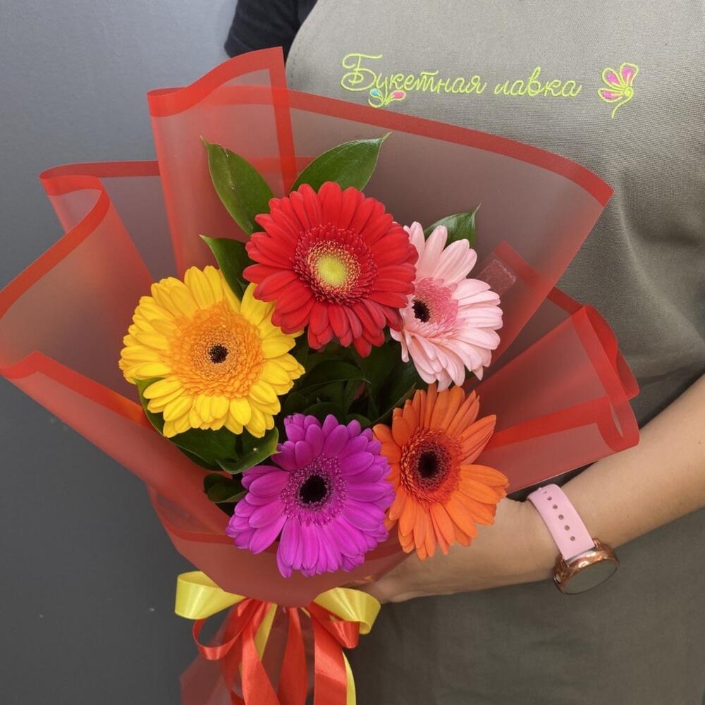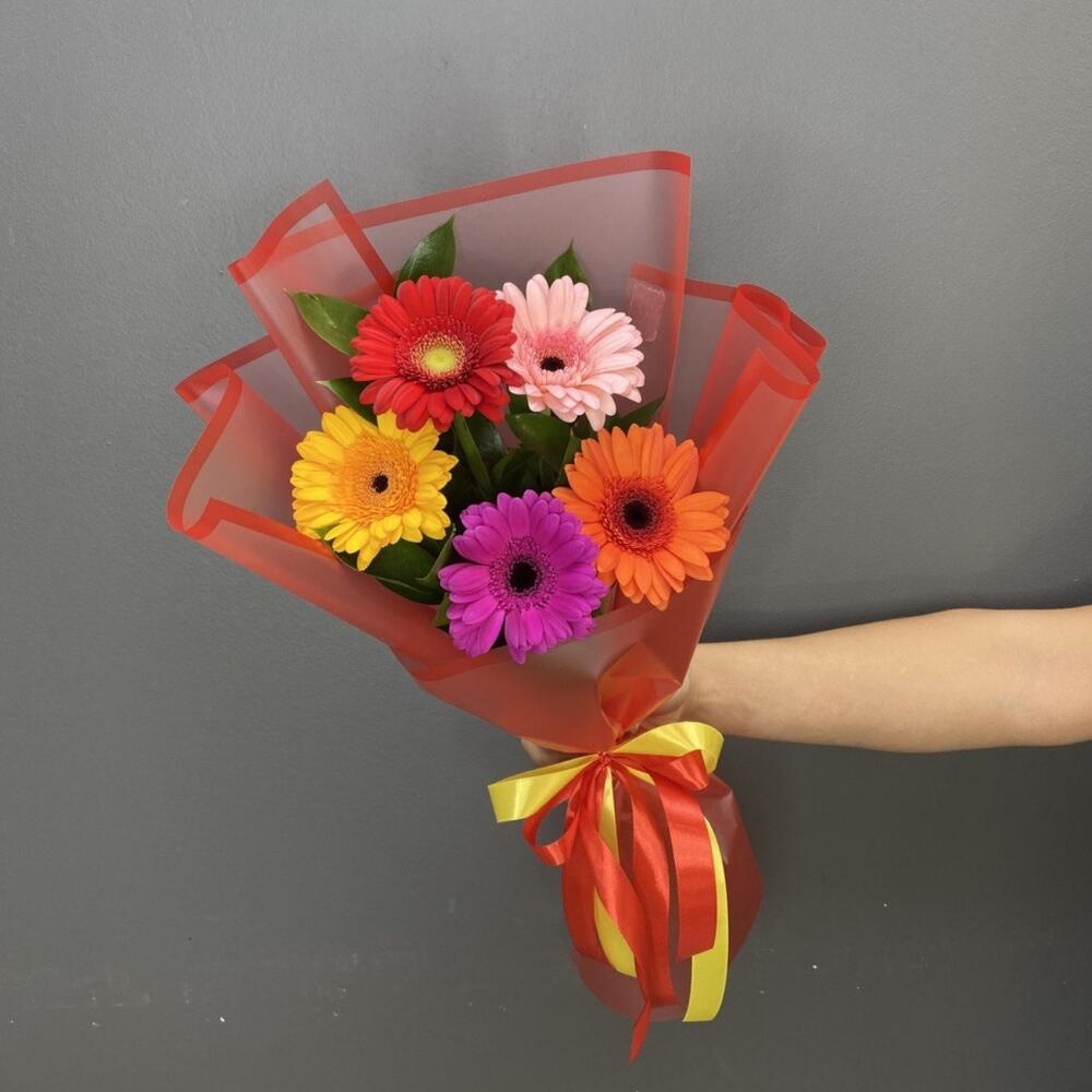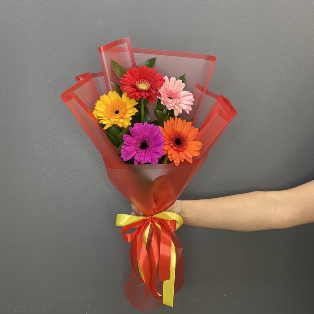 Рускус – 6 шт.Лента атласная – 1 шт.Гербера мини – 5 шт.Упаковка дизайнерская – 1 шт.