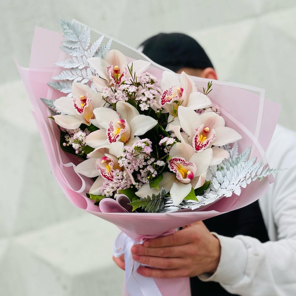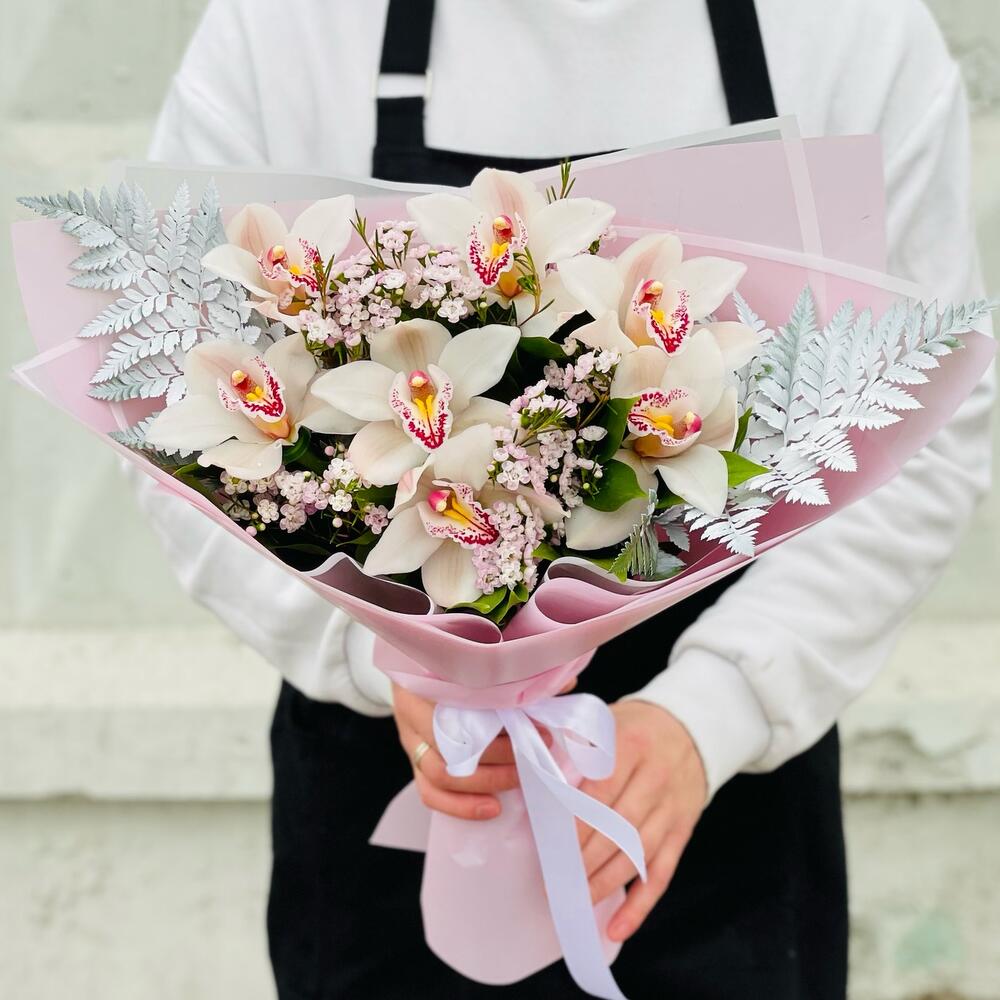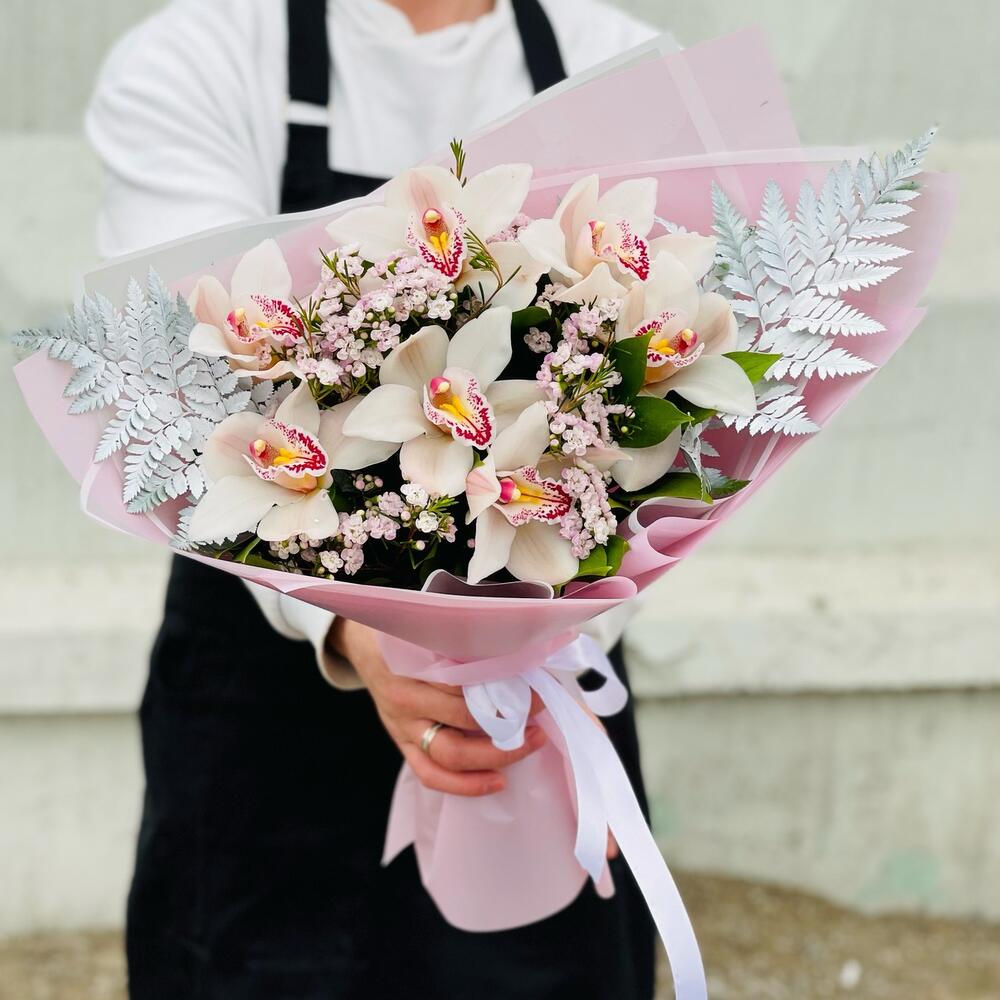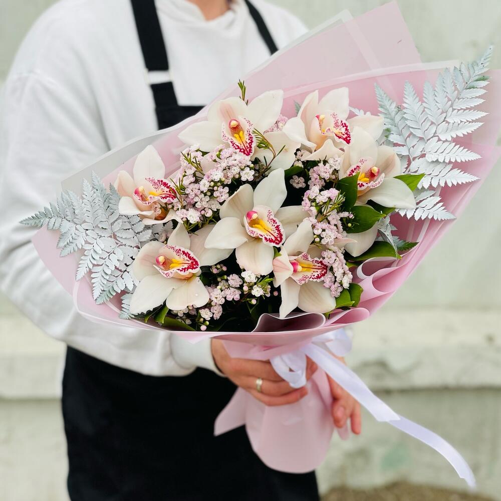 Орхидея Цимбидиум – 7 шт.Папоротник – 2 шт.Рускус – 10 шт.Лента атласная – 1 шт.Упаковка дизайнерская – 4 шт.гипсофила радужная – 2 шт.
