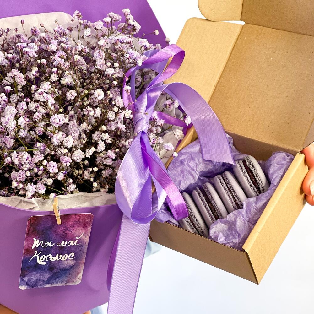 Букет из воздушной гипсофилы с макарунами «Ты мой космос “