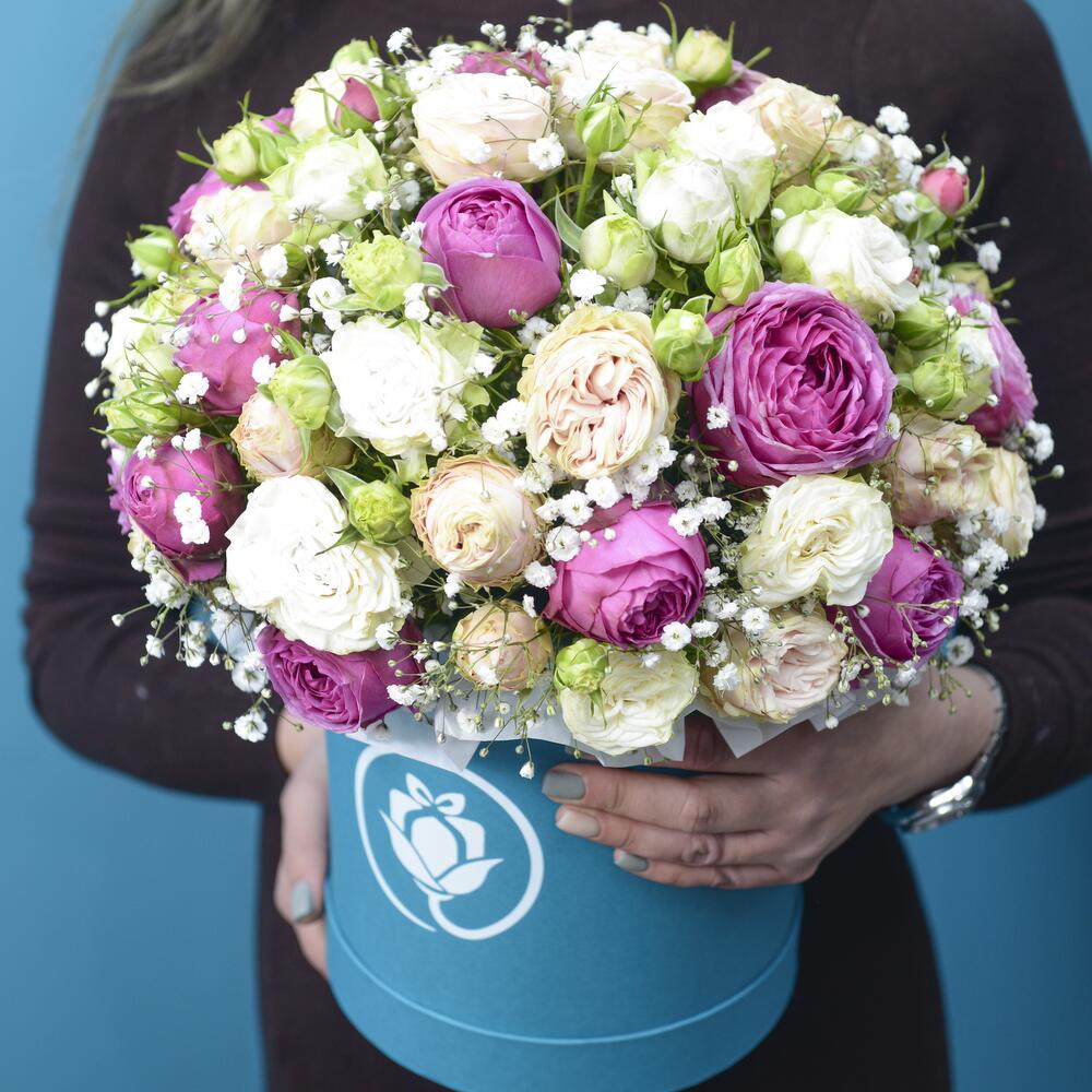 “Сиреневый туман” – композиция из гипсофилы в шляпной коробке