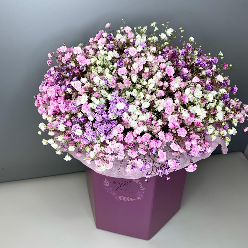 “Сиреневый туман” – композиция из гипсофилы в шляпной коробке
