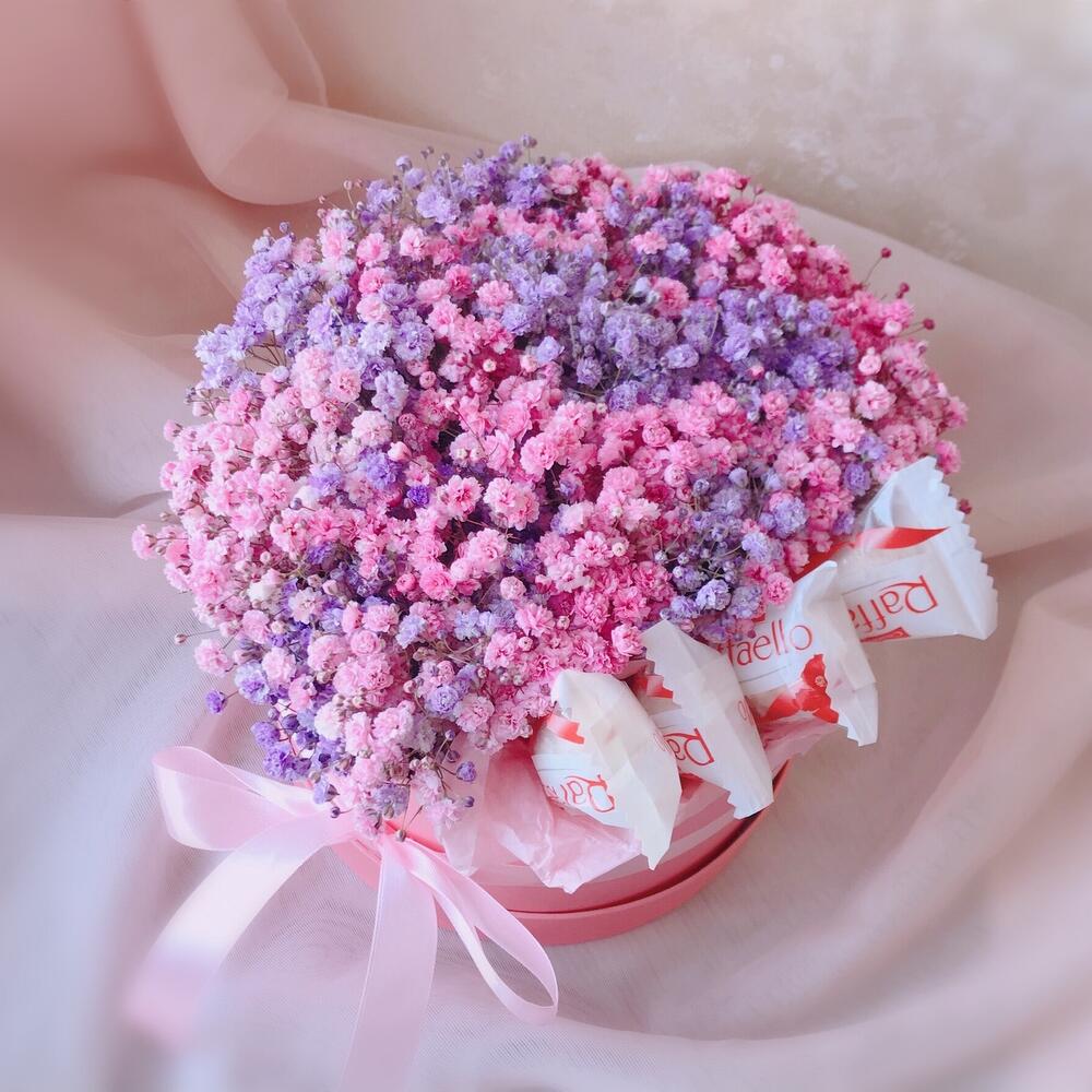 Очаровательная композиция из изысканных свежих цветов с конфетами Raffaello❤️Наполнена множеством соцветий радужной гипсофилы. Собрана в стильной шляпной коробке.Композиция из гипсофилы – необычный подарок, который удивит своей невероятной стойкостью, при правильном и простом уходе.❤️ Ставить композицию в прохладном месте, избегая отопительных приборов и прямых солнечных лучей. ❤️ Подливать немного воды в серединку.Гипсофила не вянет, а становится сухоцветом, сохраняя свой вид. Поэтому композиция продолжит радовать ещё очень долго!Почему выбирают нас? – Работаем на качество. – Бережно упакуем в транспортировочную пленку, чтобы защитить во время доставки от любых погодных условий. – Приложим инструкцию, как правильно ухаживать за цветамиСохраняйте товар в подборках, чтобы не потерять