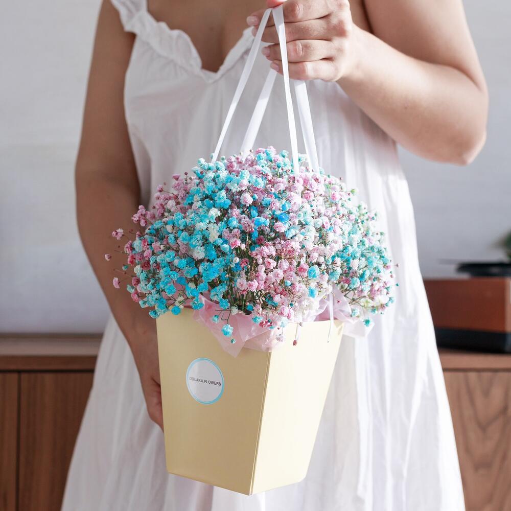 Очаровательная, воздушная композиция из гипсофилы, в коробке сумочка .Цветы стоят в специальной флористической губке,что позволяет им больше оставаться свежими и радовать получателя. Так же композиция в коробке это очень удобно и эффектно, так как не надо ставить букет в вазу и менять воду. Необходимо лишь подливать в губку воду.Инструкция по уходу за цветами прикреплена к каждому заказу.Цветы гипсофилы отличаются стойкостью и даже при высыхании не теряют, декоративности и цвета. Что позволяет, долгое время украшать интерьер в качестве сухоцветов.Подпишем открытку с вашими пожеланиями бесплатно