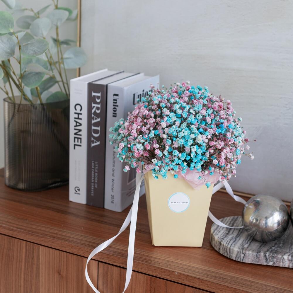 гипсофила цветная – 5 шт.Коробка с лентой – 1 шт.Губка флористическая – 1 шт.Бумага тишью – 1 шт.