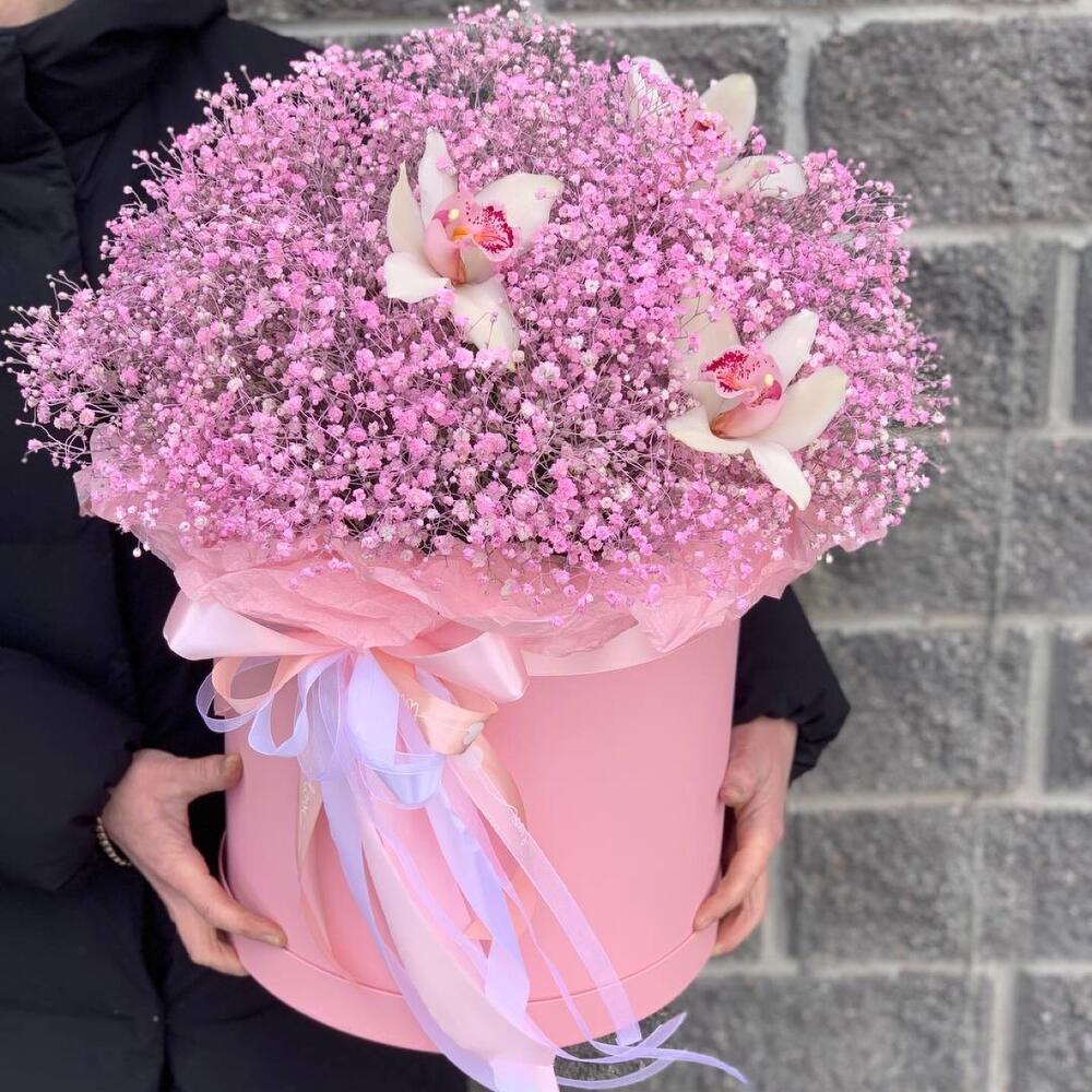 Гипсофила – 10 шт.Орхидея Цимбидиум – 3 шт.Коробка шляпная – 1 шт.Оазис флористический – 2 шт.Пленка матовая – 1 шт.Тишью – 3 шт.Лента атласная – 4 шт.