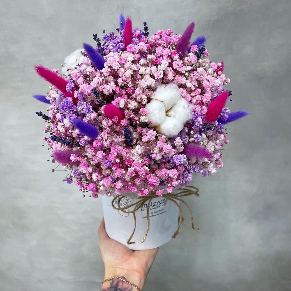 Хлопок – 3 шт. Коробка шляпная – 1 шт. Лагурус – 10 шт. Оазис флористический – 1 шт. гипсофила цветная – 7 шт.