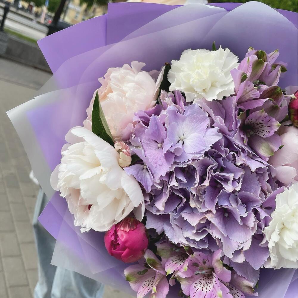 Альстромерия – 2 шт.Гортензия – 1 шт.Лента – 1 шт.Пион – 5 шт.Гвоздика – 2 шт.Корейская пленка – 2 шт.