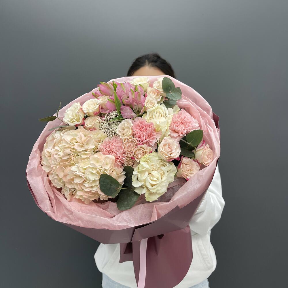 Альстромерии, Гвоздики, Кустовые розы, Лизиантусы, Розы, Хризантемы