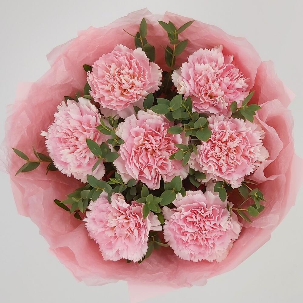 Нежный и стойкий букет из сортовых розовых динтусов и эвкалипта в стильной упаковке в тон. Такой букет всегда уместен и подойдёт для любого повода: День Рождения, именины, годовщина свадьбы, рождение ребенка, 8 марта, День Святого Валентина, выпускной и т.д. Можно вручить маме, сестре, подруге, коллеге, учителю, любимой.