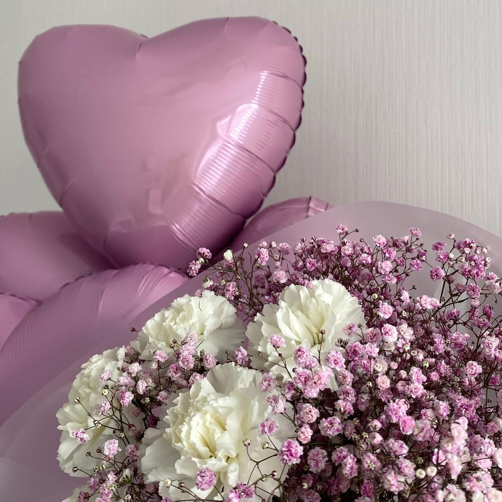 В подарочный сет входит:Фонтан из 7 фольгированных сердец с надписьюБукет из розовой гипсофилы и белых диантусов