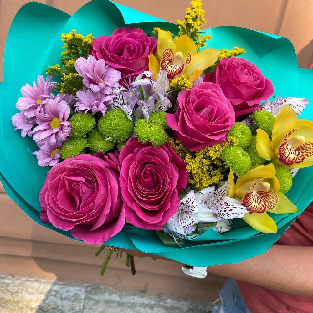 Pink floyd – 5 шт.Орхидея Цимбидиум – 3 шт.Альстромерия – 3 шт.Хризантема кустовая – 4 шт.Солидаго – 3 шт.Рускус – 5 шт.Упаковка дизайнерская – 3 шт.Лента атласная – 2 шт.
