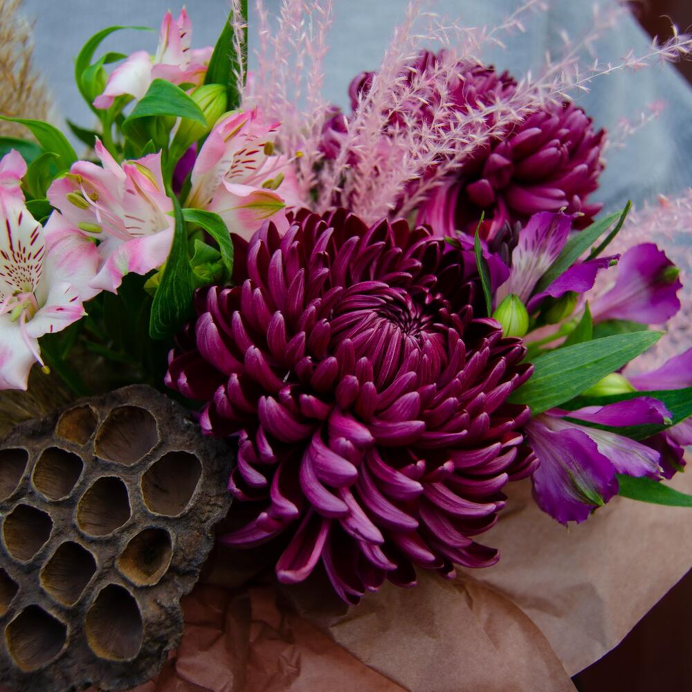 Хризантема – 3 шт. Альстромерия – 3 шт. Лотос – 1 шт. мискантус – 1 шт.