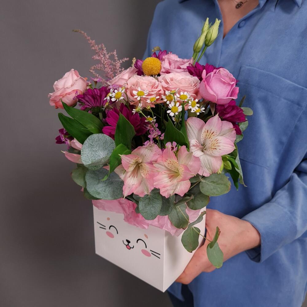 Альстромерия – 1 шт.Астильба – 3 шт.Ваксфлауэр – 1 шт.Краспедия – 1 шт.Хризантема кустовая – 1 шт.Эвкалипт – 2 шт.Эустома – 1 шт.Ромашка кустовая – 1 шт.Коробка – 1 шт.губка флористическая с водой – 1 шт.