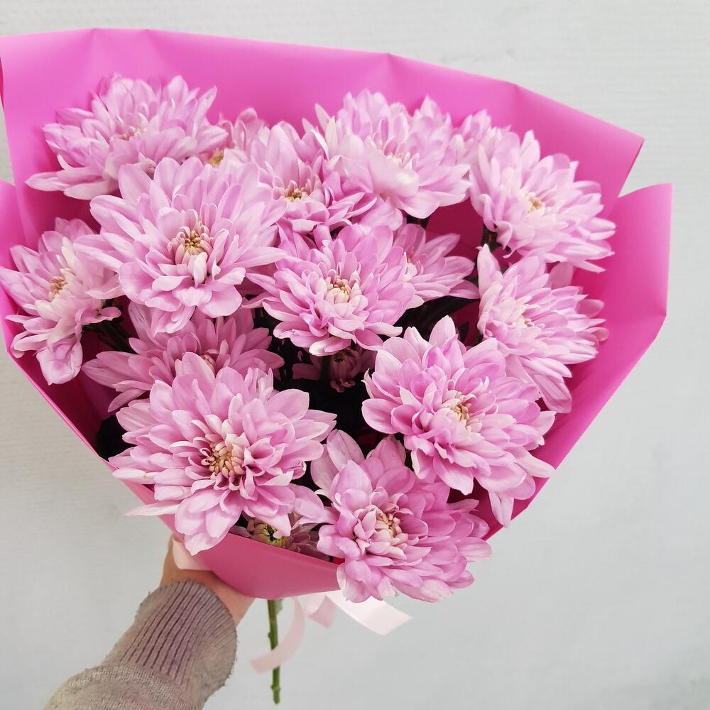 Кустовая хризантема розового цвета в дизайнерской упаковке, цветок очень прост в уходе