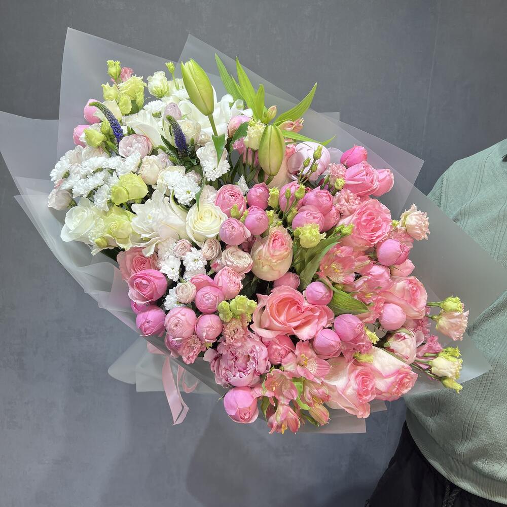 Альстромерии, Кустовые розы, Лизиантусы, Пионовидные розы, Розы, Ромашки