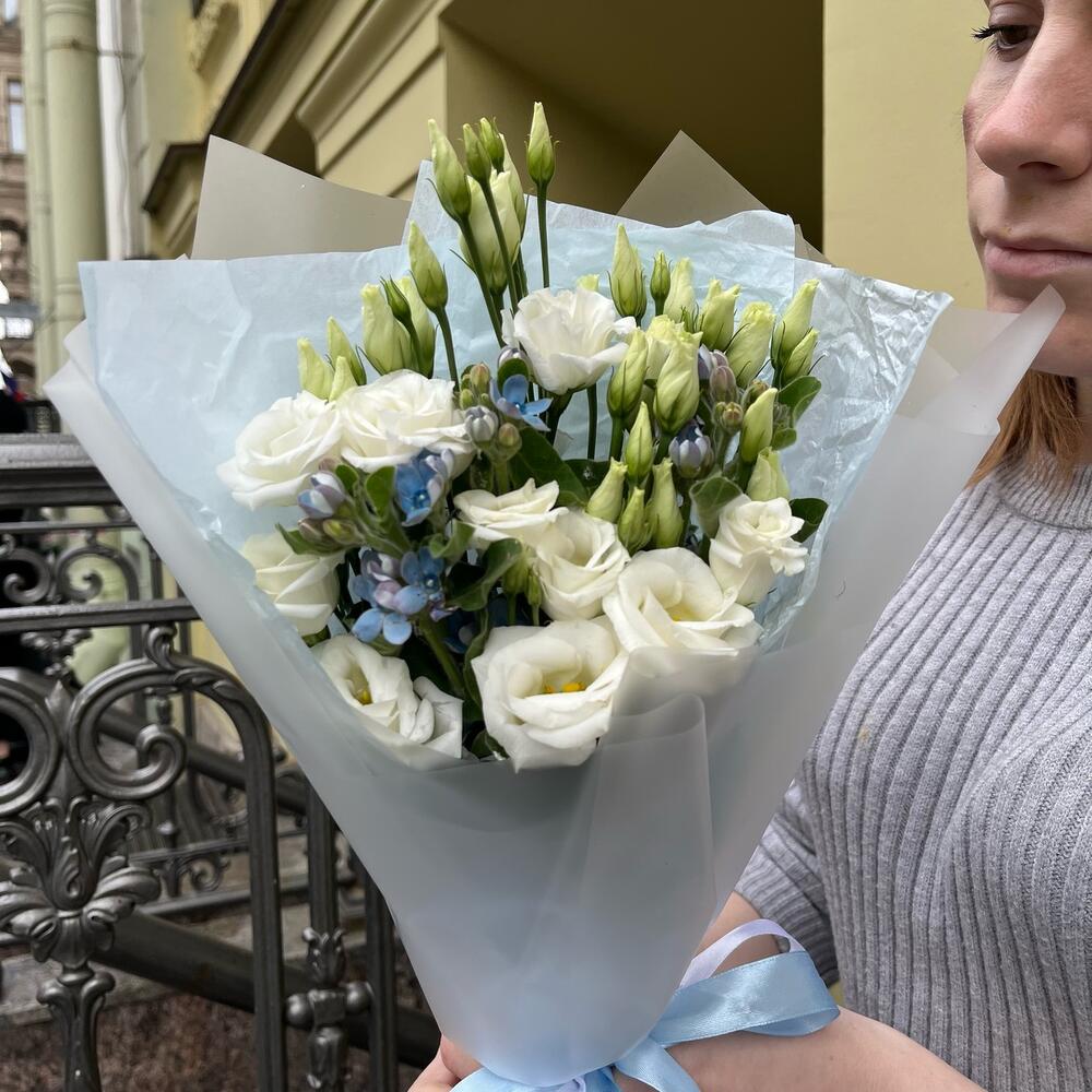 лизиантус белоснежный – 2 шт.твидия голубая – 3 шт.Упаковка корейская пленка – 1 шт.тишью нежно-голубое – 1 шт.Лента атласная белая – 1 шт.лента атласная нежно-голубая – 1 шт.