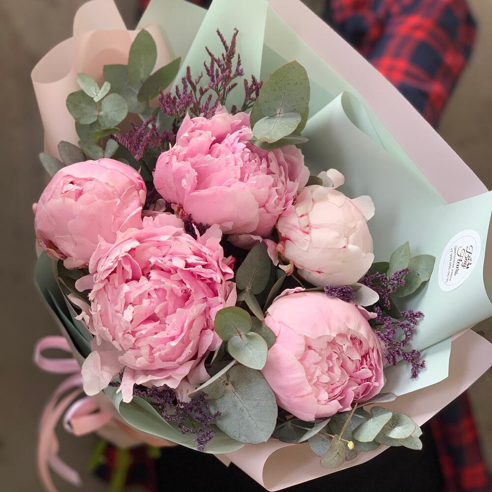 Пион Сара Бернар – 5 шт.Лимониум – 1 шт.Эвкалипт – 1 шт.Упаковка дизайнерская – 1 шт.Лента атласная – 2 шт.