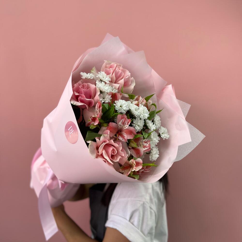 Альстромерии, Гвоздики, Кустовые розы, Лизиантусы, Розы, Хризантемы