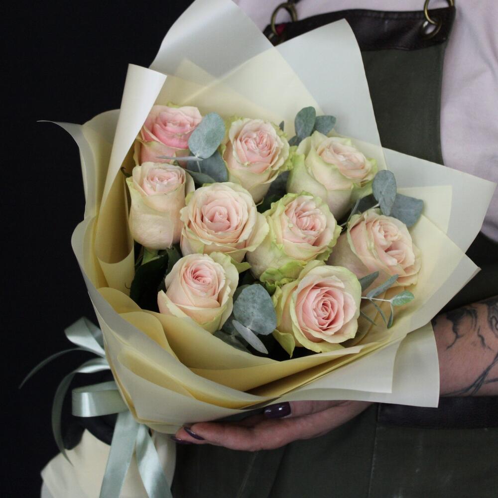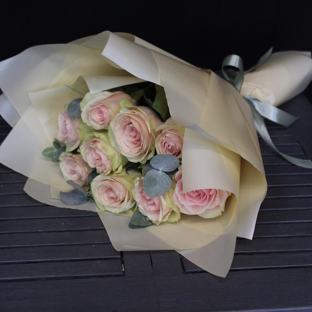 роза фруттето эквадор – 9 шт.Эвкалипт – 3 шт.Пленка матовая – 4 шт.Лента атласная – 2 шт.