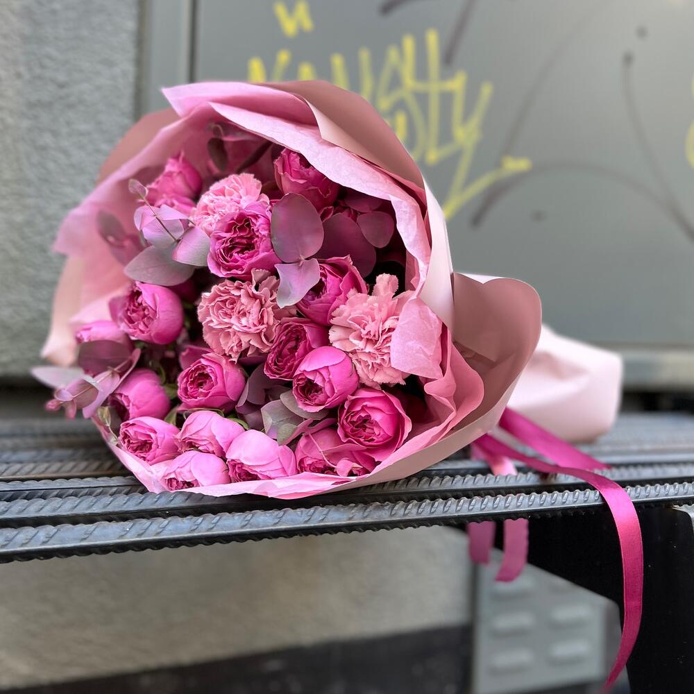 Эвкалипт – 3 шт.Лента атласная – 2 шт.Тишью – 3 шт.Диантус – 3 шт.Пленка матовая – 7 шт.роза кустовая пионовидная мисти бабл – 5 шт.