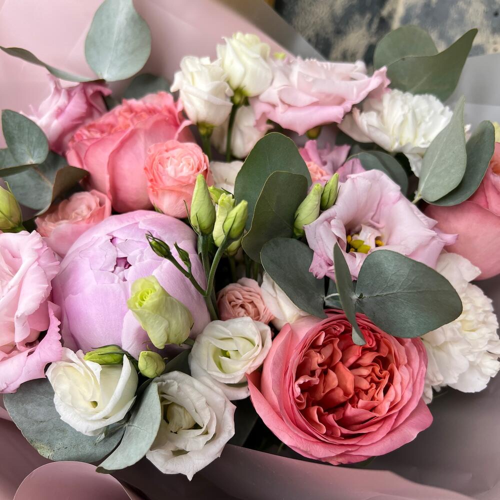 Эвкалипт – 3 шт.Лента атласная – 2 шт.Диантус – 2 шт.Пион Сара Бернар – 1 шт.Пленка матовая – 5 шт.эустома розовая махровая – 1 шт.эустома белая – 2 шт.Роза кустовая пионовидная мадам бомбастик – 1 шт.роза пионовидная пинк экспрешн – 3 шт.