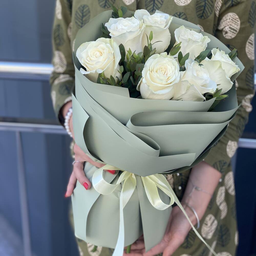 Эвкалипт – 2 шт. Роза белая – 7 шт. Оформление – 1 шт.