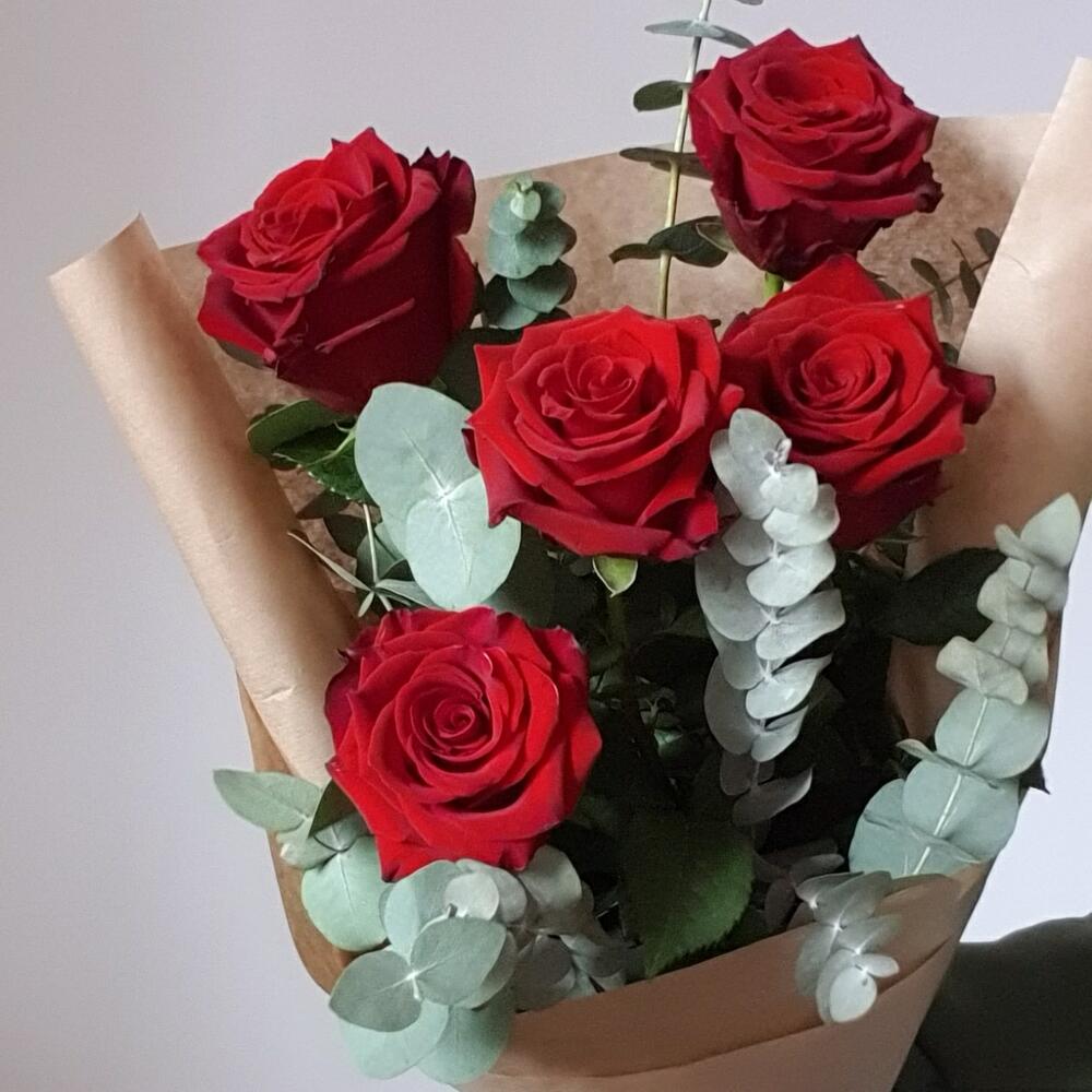 Эвкалипт – 5 шт.Упаковка – 2 шт.Лента атласная – 1 шт.Роза Эксплорер – 5 шт.