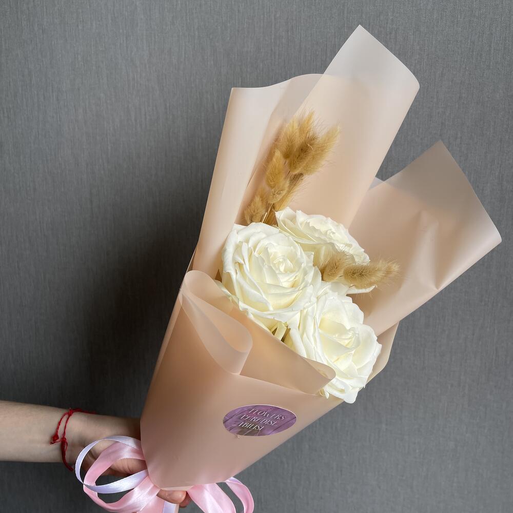 Роза – 3 шт. Лагурус – 5 шт. Упаковка – 1 шт. Атласная лента – 1 шт.