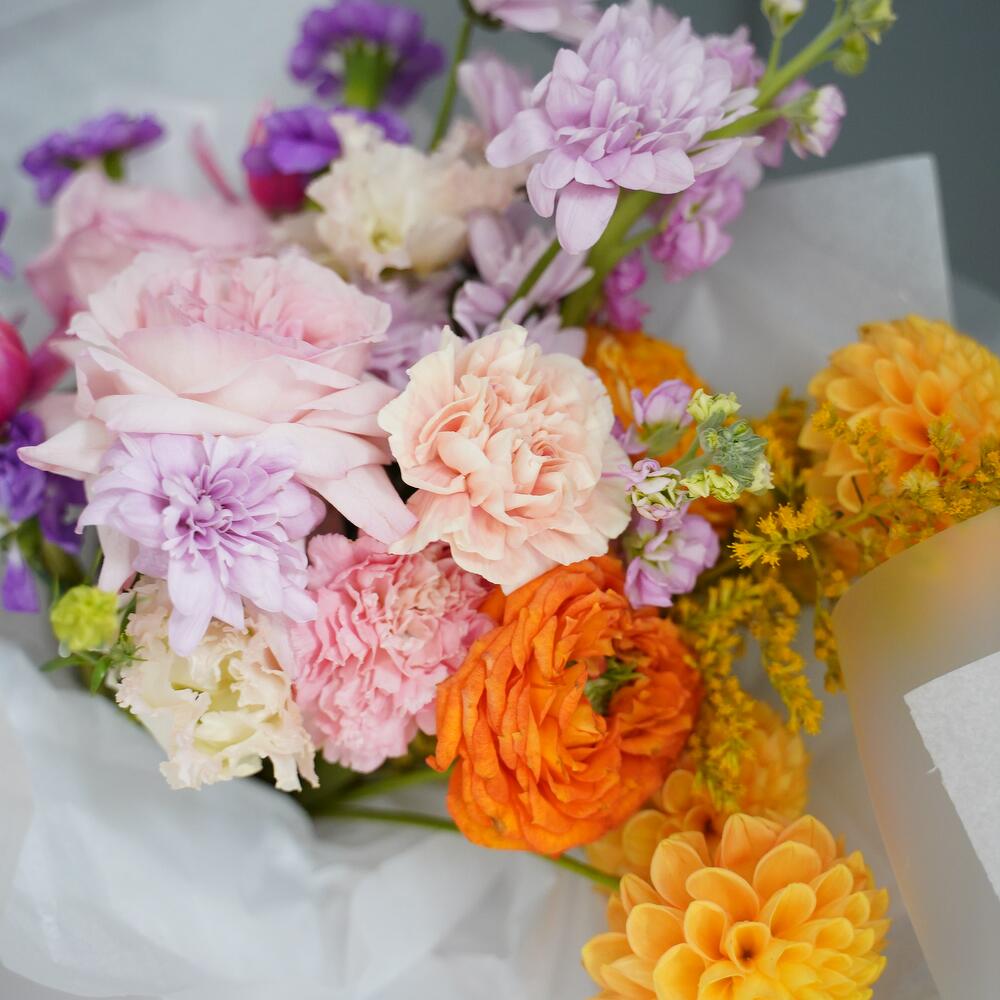 Альстромерии, Гвоздики, Кустовые розы, Лизиантусы, Розы, Хризантемы