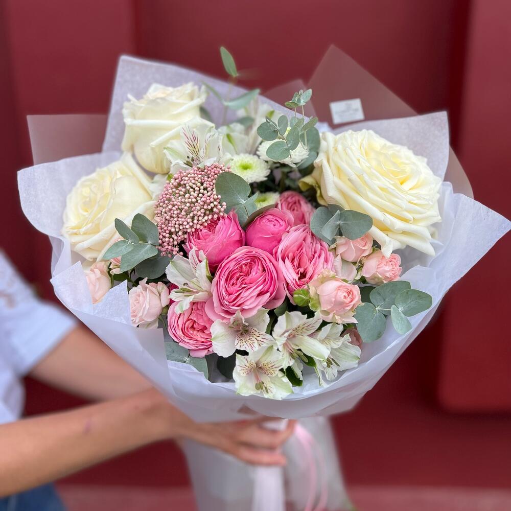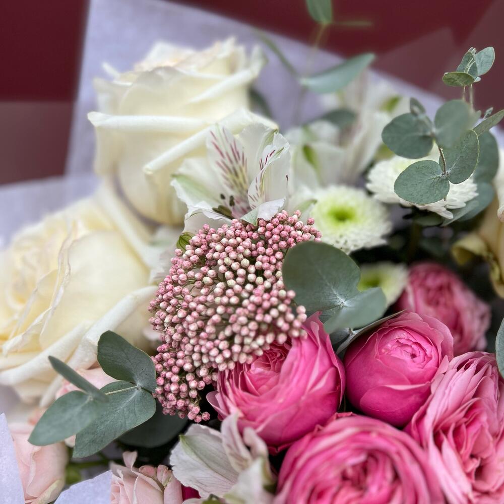 Альстромерии, Гвоздики, Кустовые розы, Лизиантусы, Розы, Хризантемы