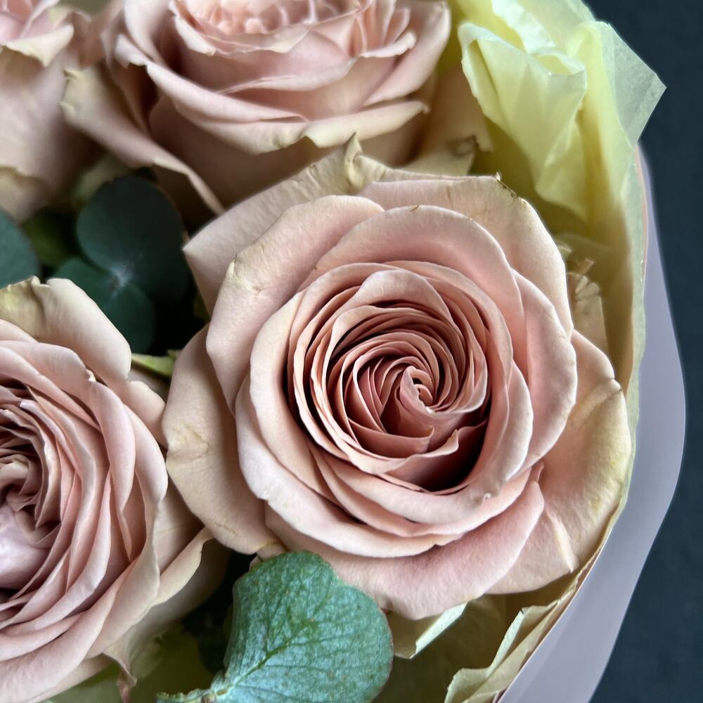 Эвкалипт – 2 шт.Лента атласная – 1 шт.Роза пионовидная – 5 шт.Дизайнерская упаковка – 1 шт.