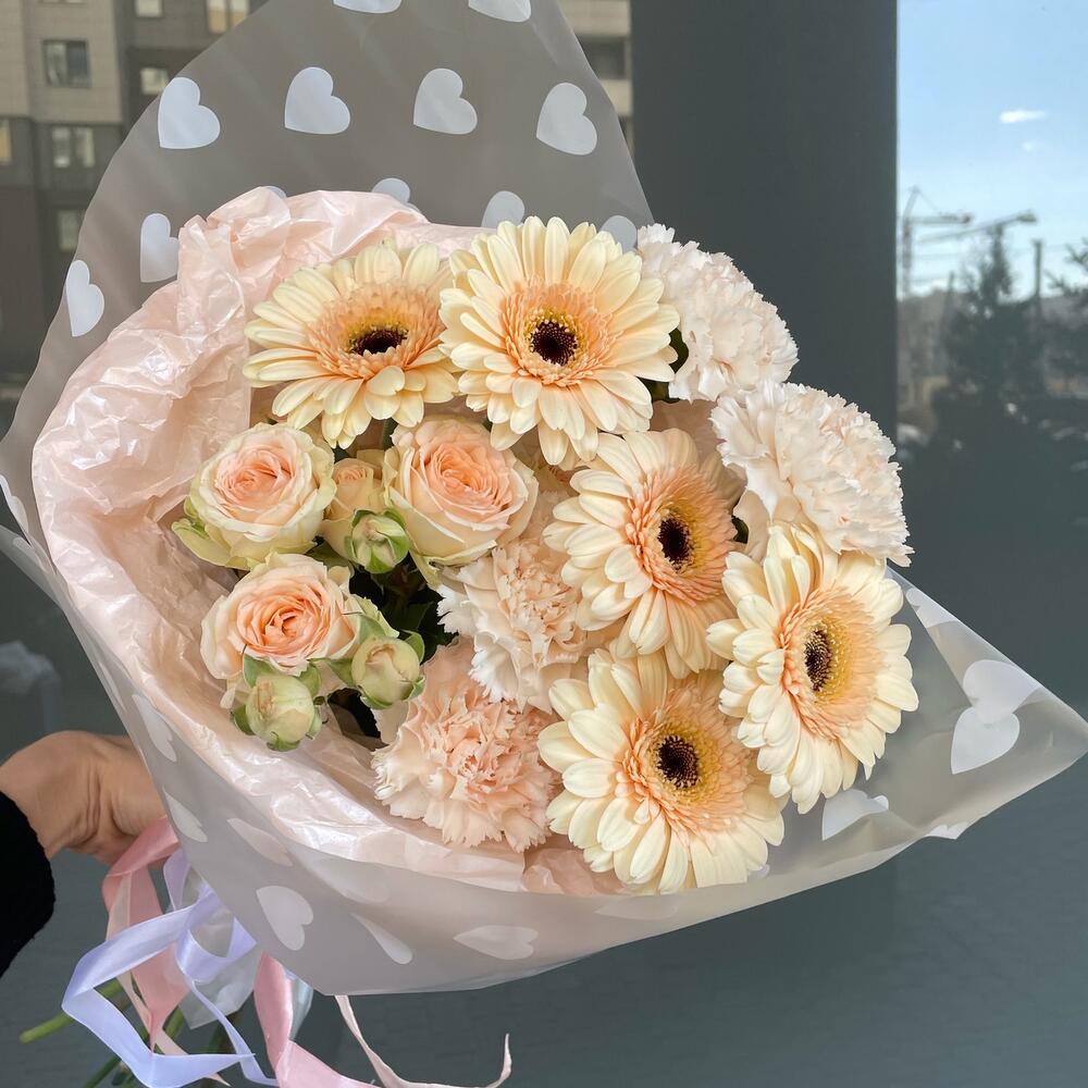 Категории: Гвоздики, Герберы, Кустовые розы, Розы