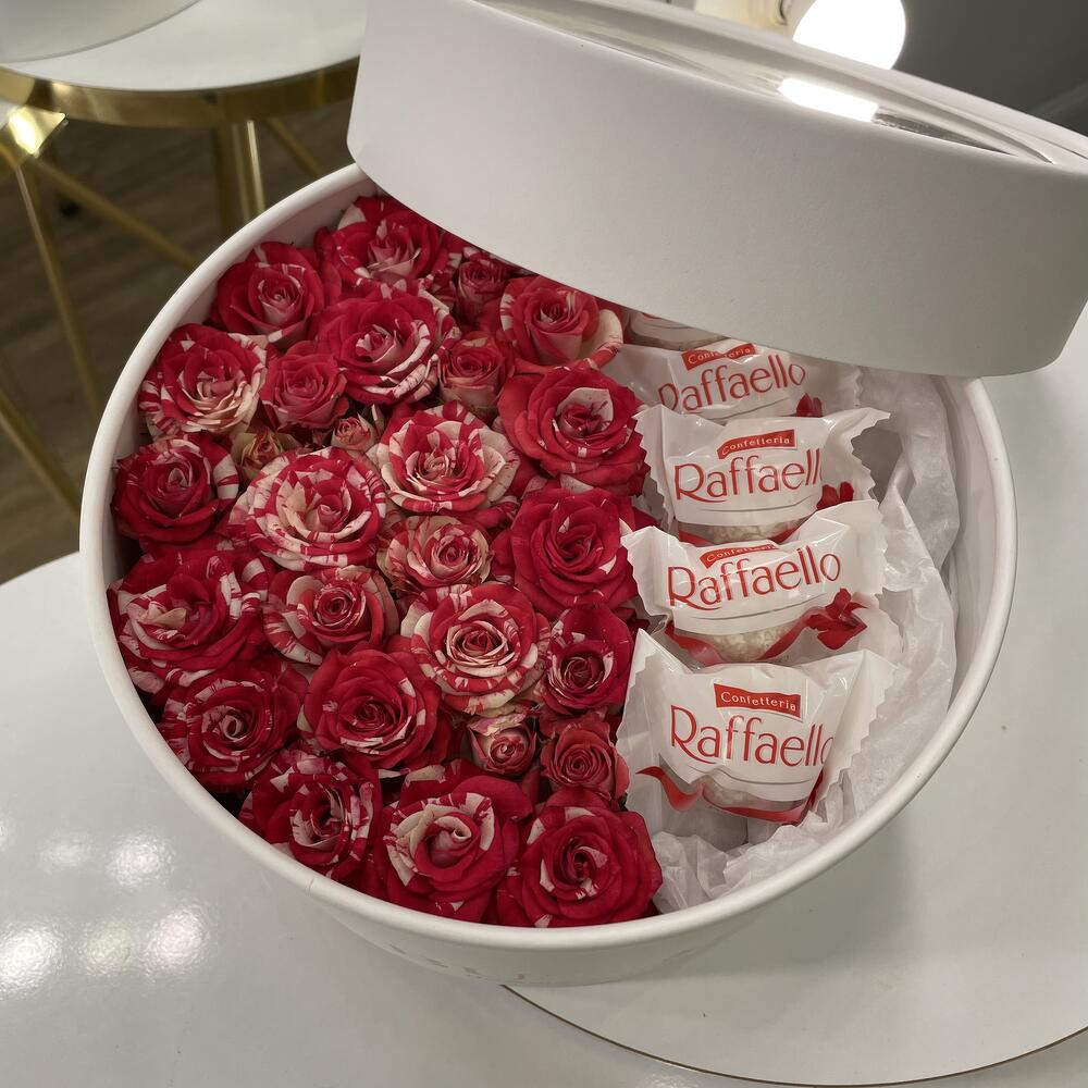 Роза кустовая – 3 шт.цилиндр плоский 21 см – 1 шт.Оазис флористический – 1 шт.Раффаэлло – 5 шт.