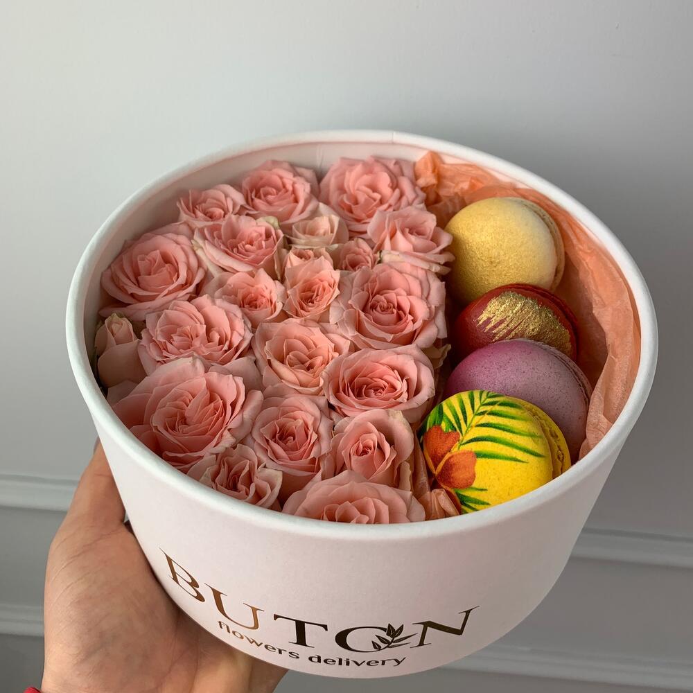 цилиндр 21 см – 1 шт.Оазис флористический – 1 шт.Роза кустовая – 7 шт.макарон (пирожное) – 4 шт.