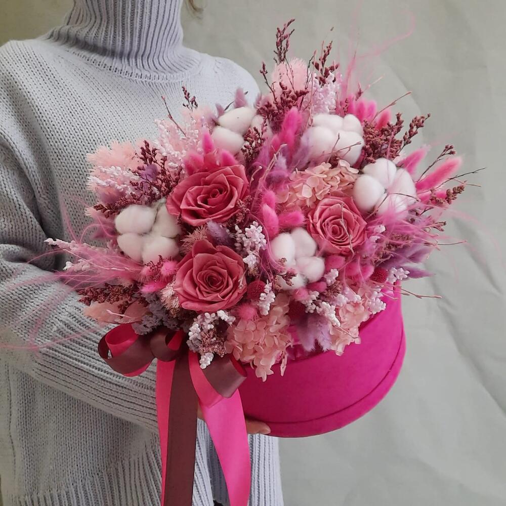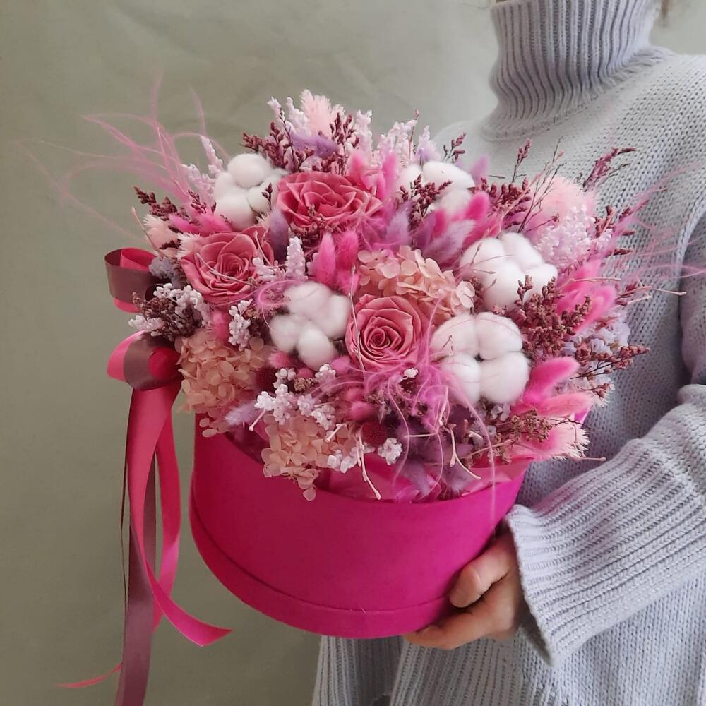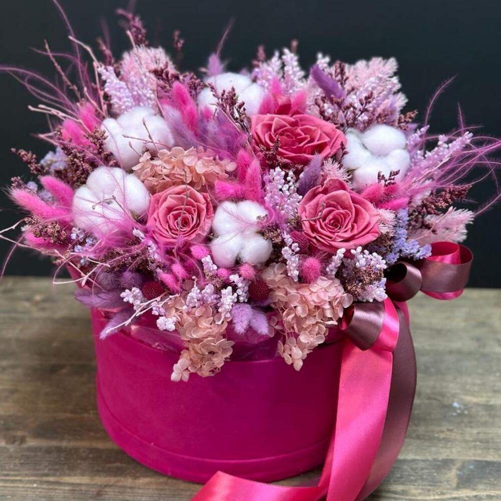 Роза стабилизированная – 3 шт.Хлопок натуральный – 5 шт.лагу рус пучок – 2 шт.Статица – 2 шт.гортензия стабилизированная – 1 шт.аспарагус стабилизированный – 1 шт.Краспедия – 3 шт.лимониум стабилизированный – 2 шт.ковыль пучок – 1 шт.берг пучок – 1 шт.ветки декоративные – 30 шт.Оазис для сухоцветов – 1 шт.Коробка бархатная – 1 шт.Лента атласная – 2 шт.