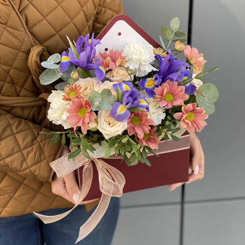 Конверт с цветами из ирисов, хризантемы, кустовой розы, сортовой гвоздики и зелени!