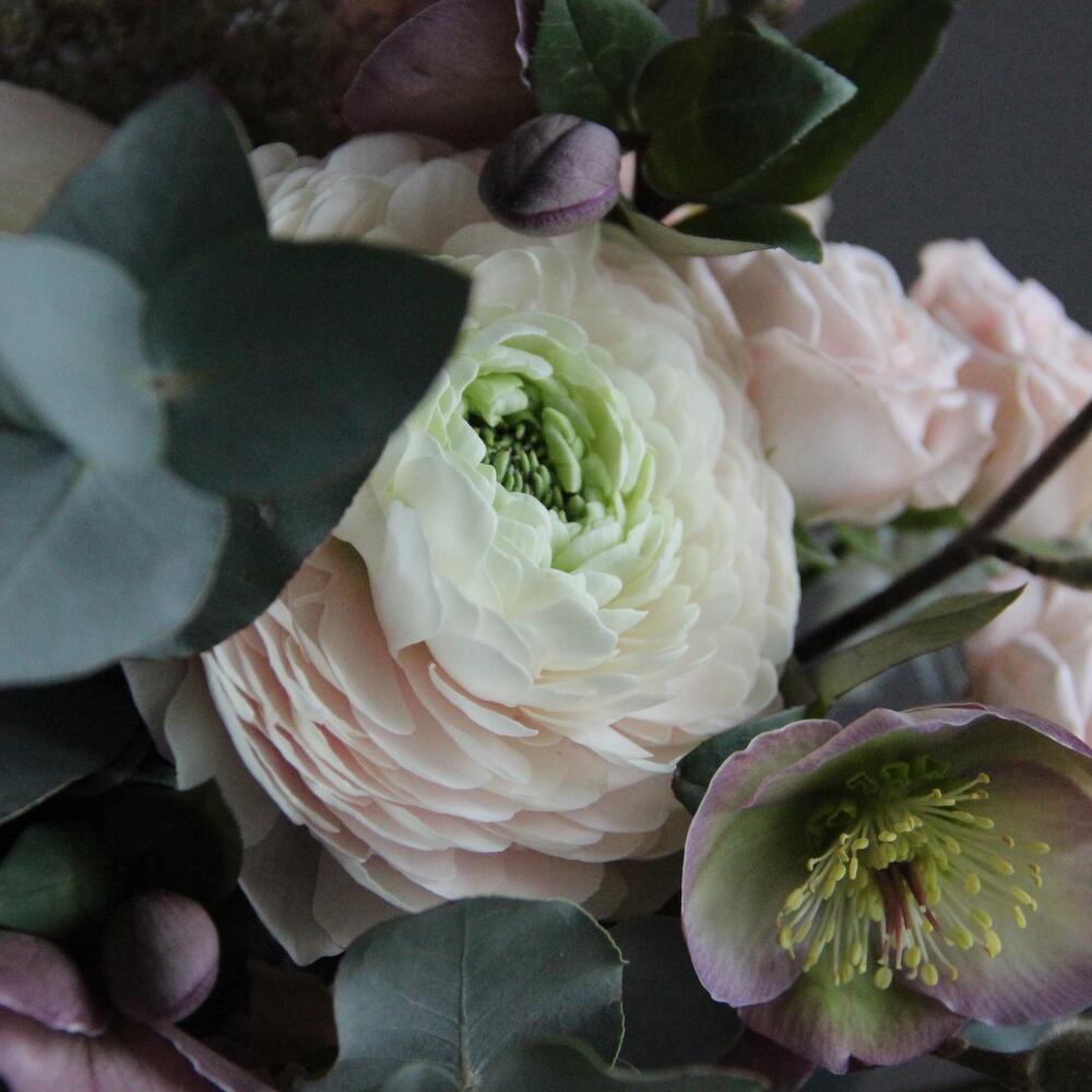 магнолия ветки – 2 шт.Ранункулюс – 3 шт.Амми – 3 шт.Маттиола – 3 шт.Хелеборус – 2 шт.Хризантема момоко – 2 шт.авена – 3 шт.Сантини – 2 шт.Эвкалипт – 5 шт.Роза кустовая пионовидная – 2 шт.Лента атласная – 1 шт.