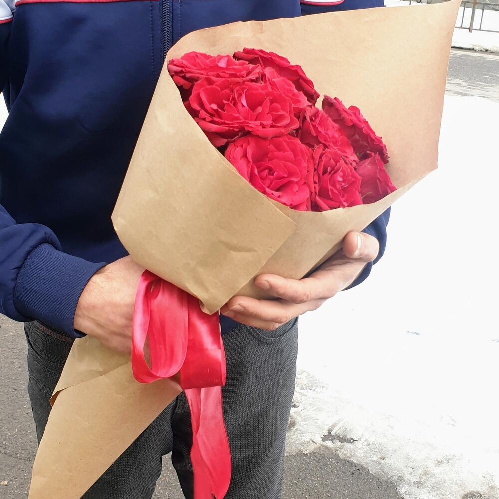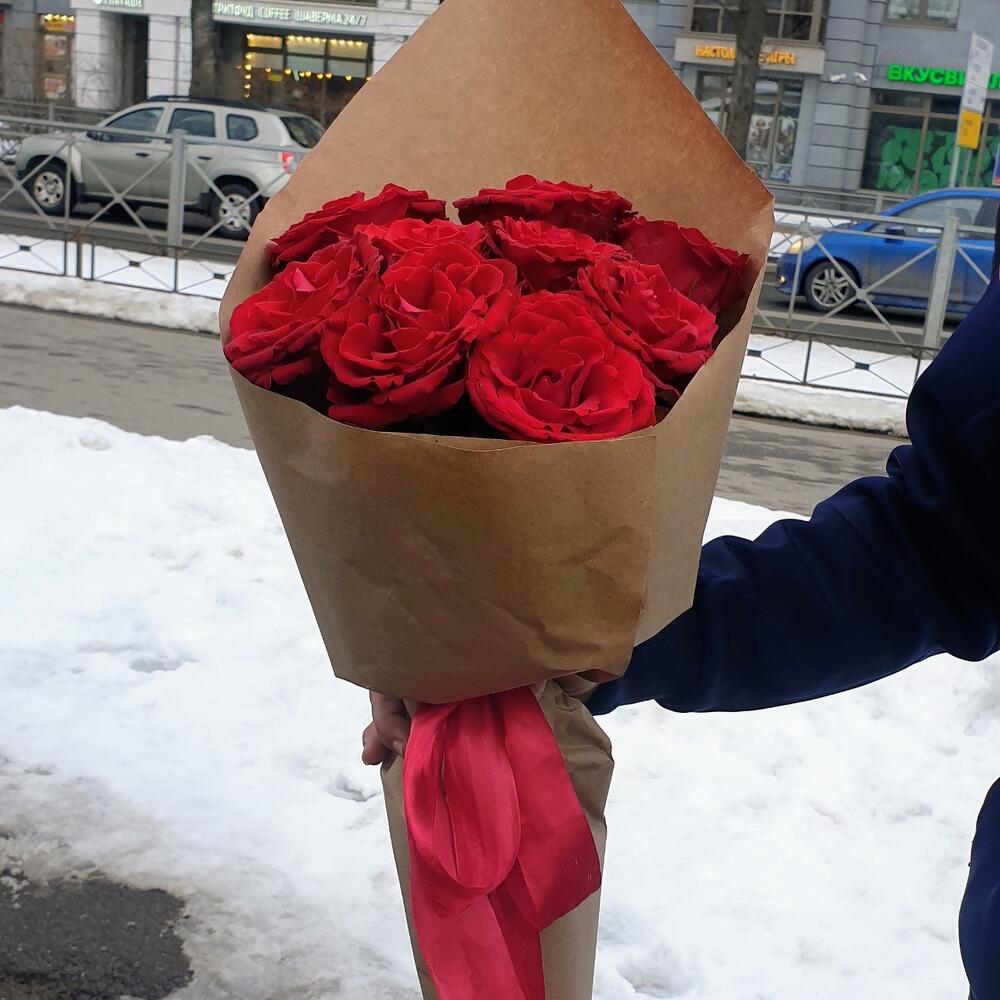 Роза красная – 9 шт.Крафт упаковка – 1 шт.Лента атласная – 1 шт.
