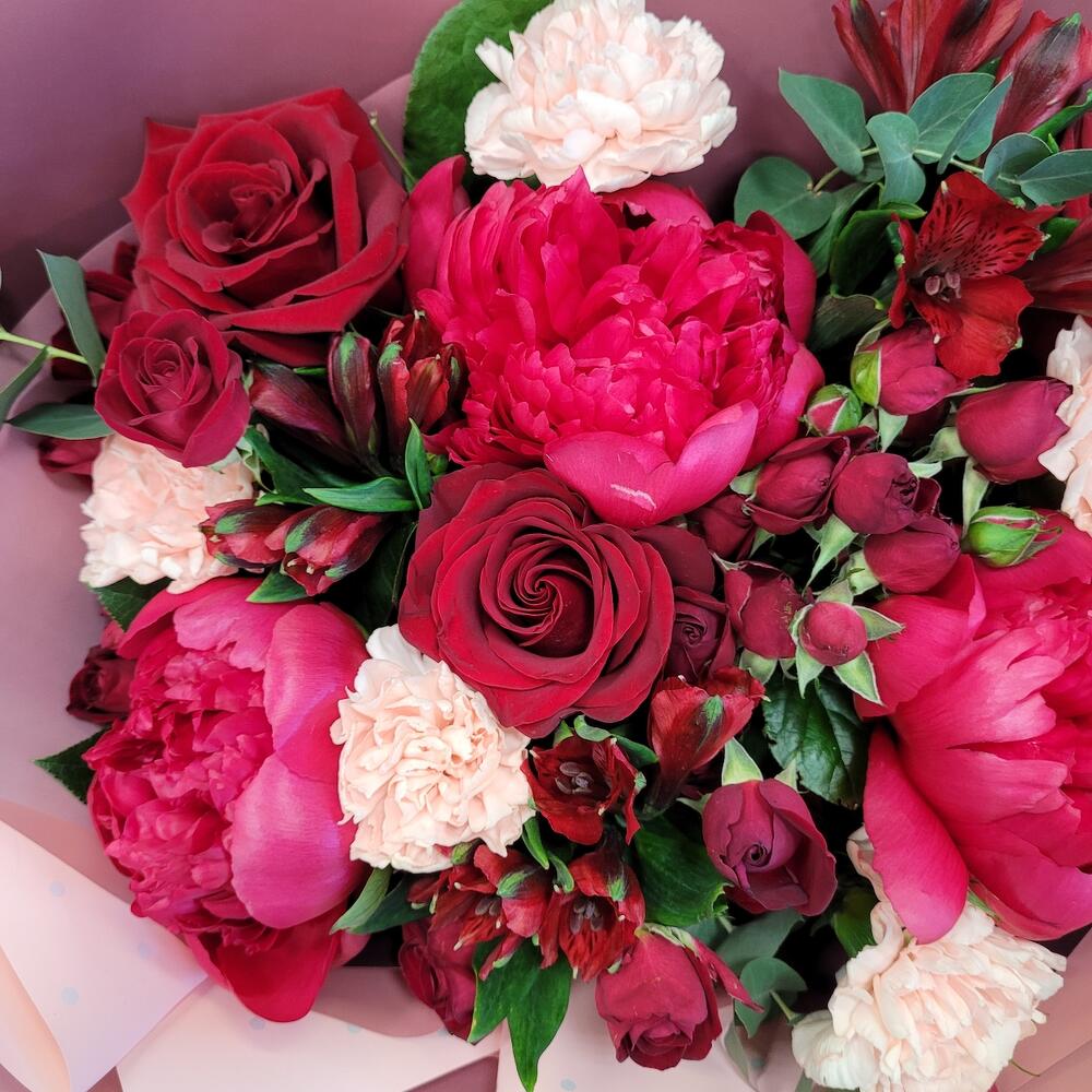 Гвоздики, Кустовые розы, Лизиантусы, Пионовидные розы, Розы