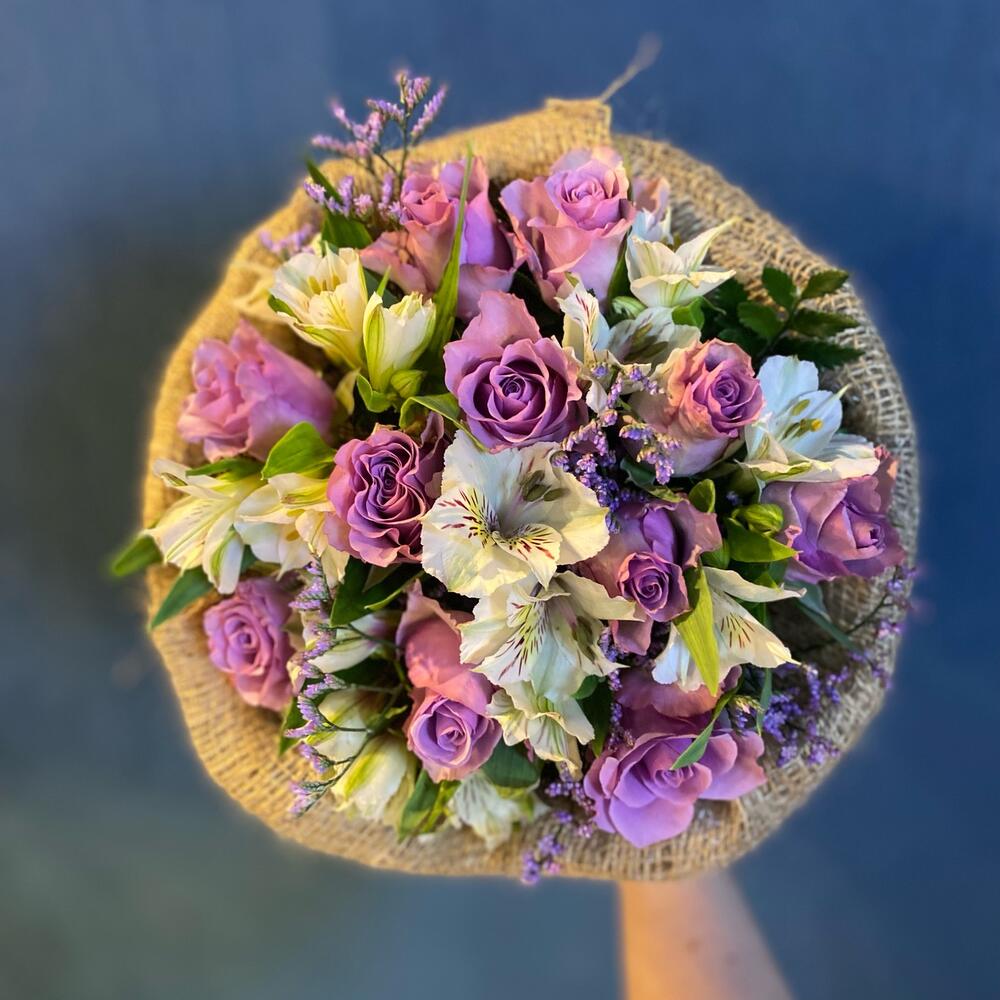Розы с альстромерией в мешковине