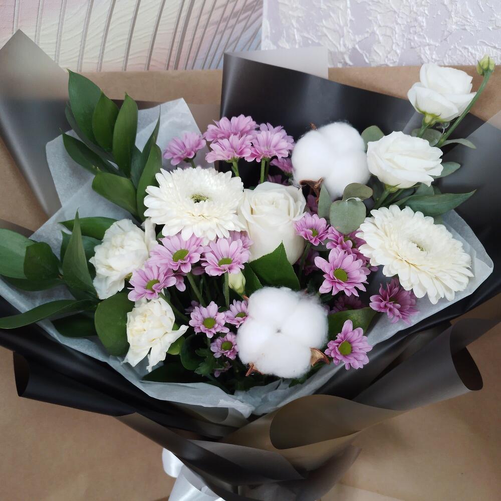 Хлопок натуральный – 2 шт.Роза Эквадор – 1 шт.Хризантема Сантини – 3 шт.эустома белая – 1 шт.Гвоздика – 2 шт.Эвкалипт – 1 шт.Рускус Израиль – 2 шт.Упаковка дизайнерская – 1 шт.Лента атласная – 1 шт.