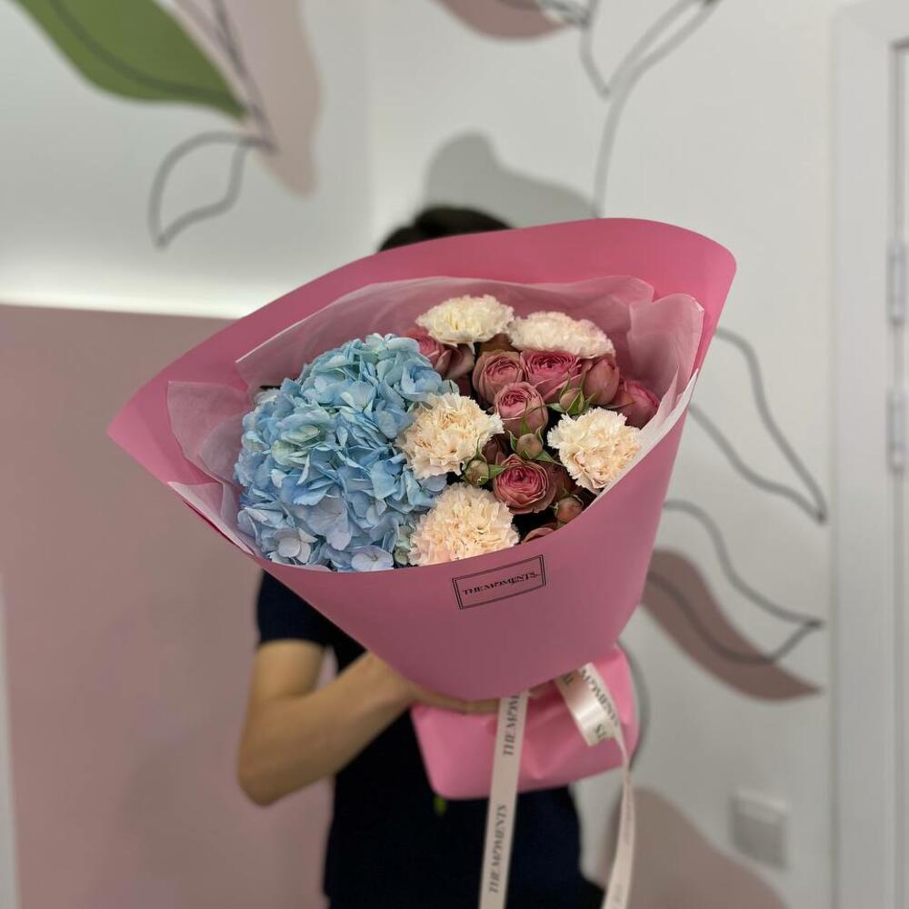 Альстромерии, Гортензии, Кустовые розы, Лизиантусы, Розы, Хризантемы