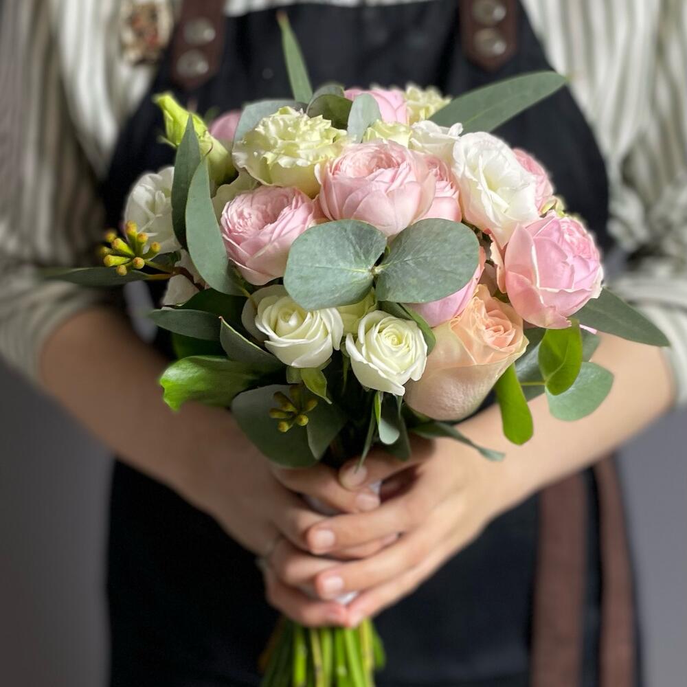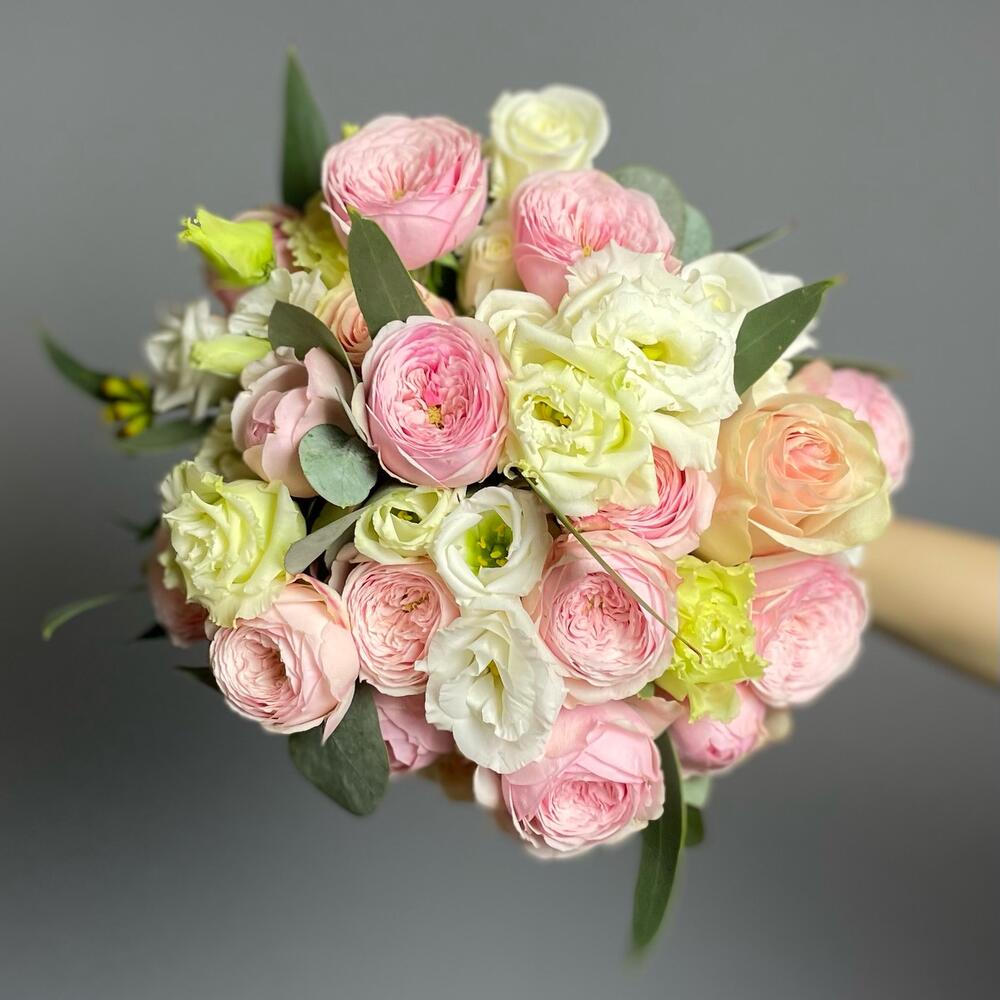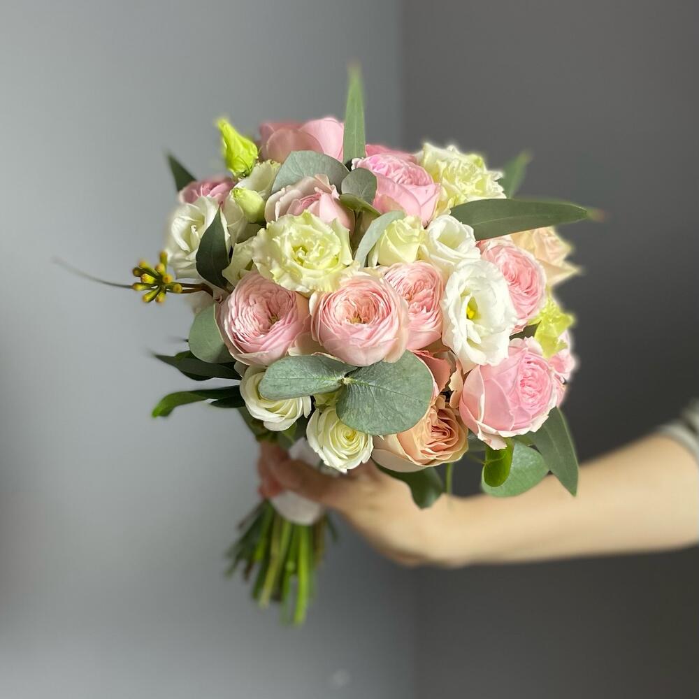 Свадебный букет + бутоньерка, оформленные в атласную ленту.Цветы заказываются индивидуально под каждый букет, поэтому заказ лучше делать минимум за 10 дней до торжества
