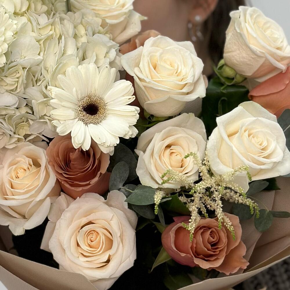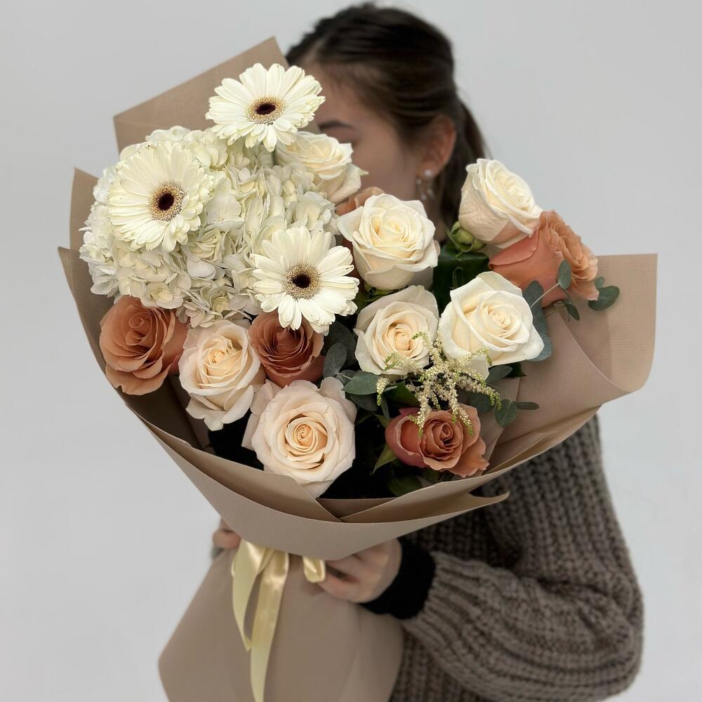 Гортензия – 1 шт. Гербера – 3 шт. Голландская роза – 11 шт.