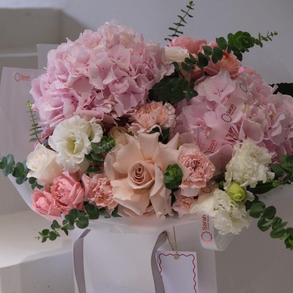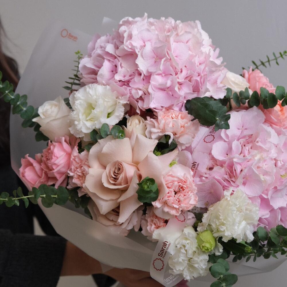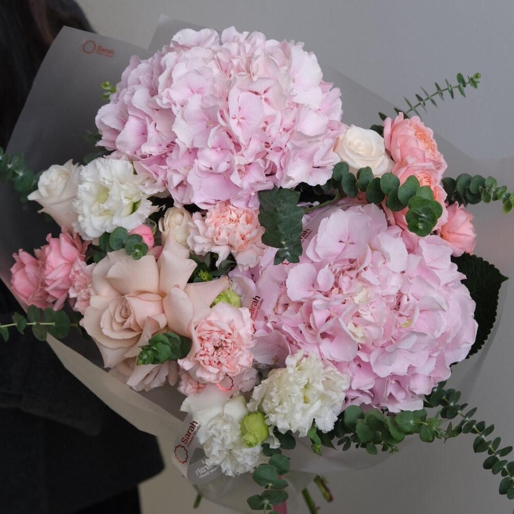 Альстромерии, Гортензии, Кустовые розы, Лизиантусы, Розы, Хризантемы