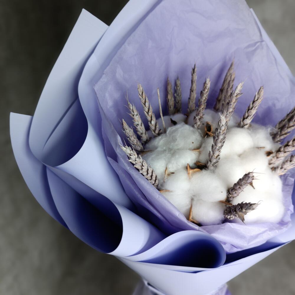 Хлопок – 9 шт.Лента атласная – 2 шт.Кружево – 1 шт.Корейская пленка – 2 шт.Тритикум(пшеница) – 16 шт.Бумага тишью – 1 шт.
