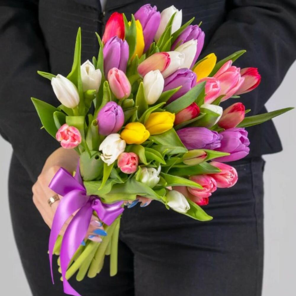 Тюльпан микс – 35 шт.Атласная лента – 1 шт.