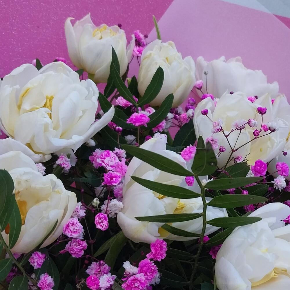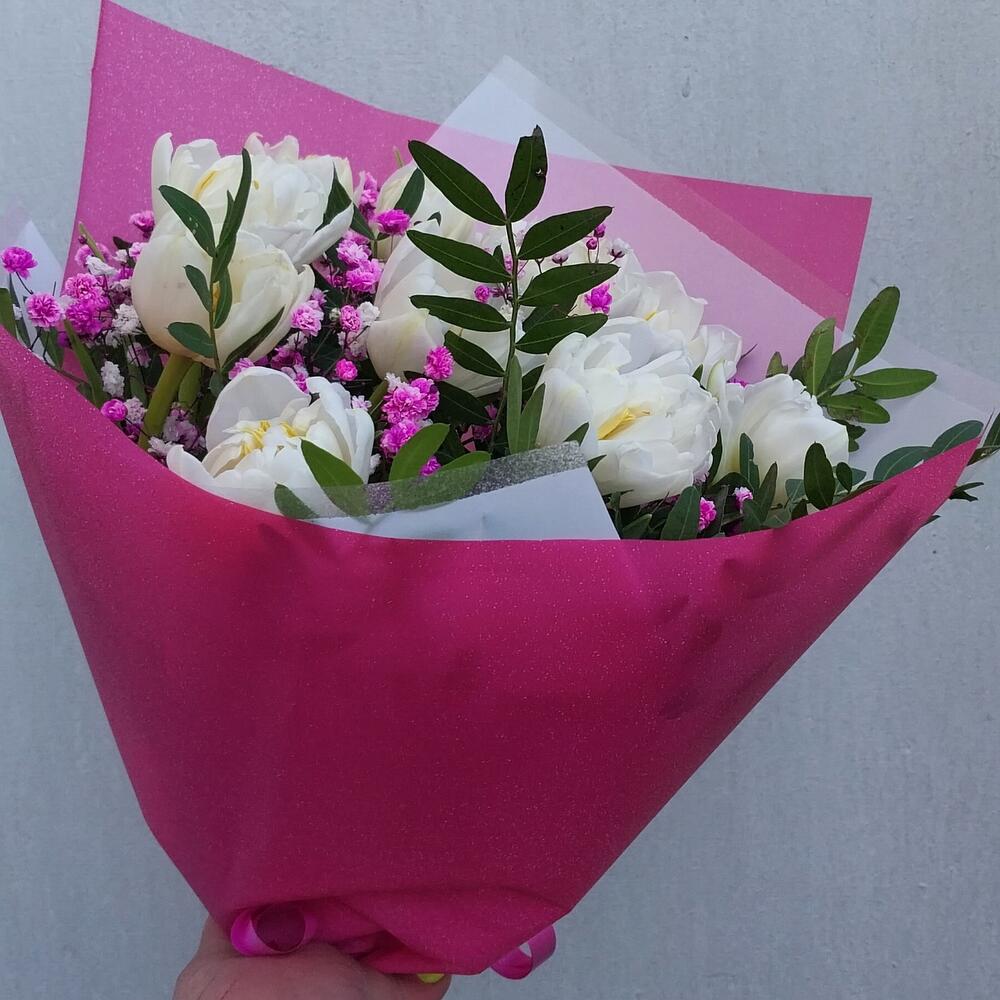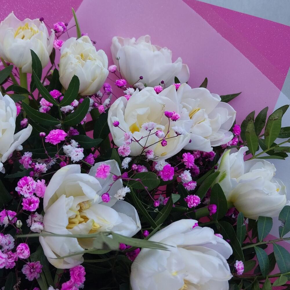 Лента атласная – 1 шт.Упаковка дизайнерская – 2 шт.Гипсофила розовая – 1 шт.тюльпан пионовидный белый – 11 шт.фисташка зелень – 5 шт.